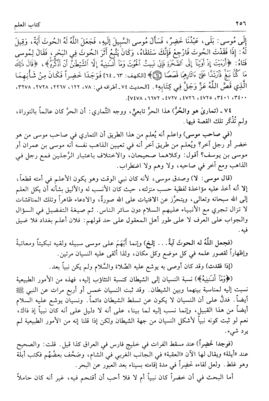 إِلَى مُوسَى بَلَى، عَبْدُنَا خَضِرٌ، فَسَأَلَ مُوسَى السَّبِيلَ إِلَيْهِ، فَجَعَلَ اللَّهُ لَهُ الْحُوتَ آيَةً، وَقِيلَ لَهُ إِذَا فَقَدْتَ الْحُوتَ فَارْجِعْ، فَإِنَّكَ سَتَلْقَاهُ، وَكَانَ يَتَّبِعُ أَثَرَ الْحُوتِ فِى الْبَحْرِ، فَقَالَ لِمُوسَى فَتَاهُ: {أَرَأَيْتَ إِذْ أَوَيْنَا إِلَى الصَّخْرَةِ فَإِنِّي نَسِيتُ الْحُوتَ وَمَا أَنْسَانِيهُ إِلَّا الشَّيْطَانُ أَنْ أَذْكُرَهُ}، {قَالَ ذَلِكَ مَا كُنَّا نَبْغِ فَارْتَدَّا عَلَى آثَارِهِمَا قَصَصًا (64)} [الكهف: 63 - 64]، فَوَجَدَا خَضِرًا. فَكَانَ مِنْ شَأْنِهِمَا الَّذِى قَصَّ اللَّهُ - عَزَّ وَجَلَّ - فِى كِتَابِهِ». أطرافه 78، 122، 2267، 2728، 3278، 3400، 3401، 4725، 4726، 4727، 6672، 7478 - تحفة 39 - 29/ 1