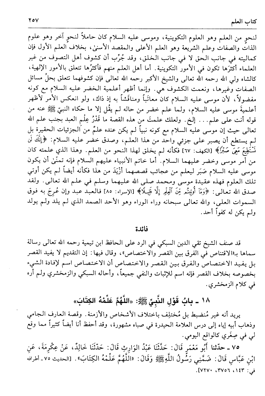 لنحوٍ من العلم وهو العلوم التكوينية، وموسى عليه السلام كان حاملًا لنحوٍ آخر وهو علوم الذات والصفات وعلم الشريعة وهو العلم الأعلى والمقصد الأسنى، بخلاف العلم الأول فإن كماليته في جانب الحق لا في جانب الخلق، وقد جُرِّب أن كشوف أهل التصوف من غير العلماء أكثرَها تكون في الأمور التكوينية. أما أهل العلم منهم فأكثرُها تتعلق بالأمور الإلهية، كالشاه ولي الله رحمه الله تعالى والشيخ الأكبر رحمه الله تعالى فإن كشوفهما تتعلق بحلِّ مسائل الصفات وغيرها، ونعمت الكشوف هي. وإنما أظهر أعلمية الخضر عليه السلام مع كونه مفضولًا، لأن موسى عليه السلام كان معاتَبًا ومناقَشًا به إذ ذاك، ولو انعكس الأمر لأظهر أعلميةَ موسى عليه السلام، ولما علم خضر من حاله لم يقُل إلا ما حكاه النبيّ صلى الله عليه وسلّم عنه من قوله أنت على علم ... إلخ. ولعلك علمتَ من هذه القصة ما قَدْرُ عِلْمِ العبد بجنب علم الله تعالى حيث أن موسى عليه السلام مع كونه نبيًا لم يكن عنده علمٌ من الجزئيات الحقيرة بل لم يستطع أن يصبر على جزئي واحد من هذا العلم، وصدق خضر عليه السلام: {إِنَّكَ لَنْ تَسْتَطِيعَ مَعِيَ صَبْرًا} [الكهف: 67] فكأنه لم يخلق لهذا النحو من العلم. وهذا الذي علمته كان من أمر موسى وخضر عليهما السلام. أما خاتم الأنبياء عليهم السلام فإنه تمنّى أن يكون موسى عليه السلام صَبَر ليعلم من عجائب قصصهما أزْيَدَ من هذا فكأنه أيضًا لم يكن أوتي تلك العلوم فهذه عقيدة موسى ومحمد صلى الله عليهما وسلم في علم الله تعالى. ولقد صدق الله تعالى: {وَمَآ أُوتِيتُم مّن الْعِلْمِ إِلاَّ قَلِيلًا} [الإسراء: 85] فالعبد عبد وإن عُرِجَ به فوق السموات العلى، والله تعالى سبحانه وراء الوراء وهو الأحد الصمد الذي لم يلد ولم يولد ولم يكن له كفوًا أحد.