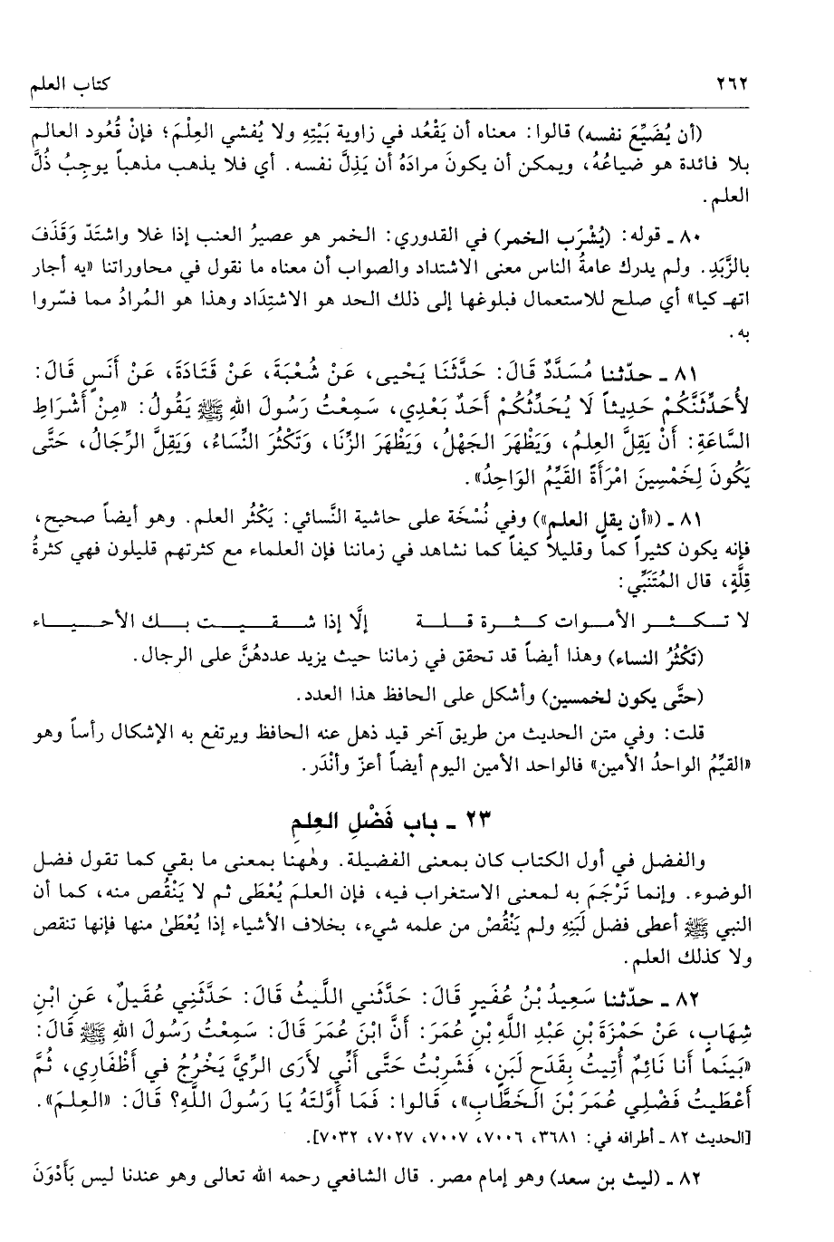 81 - («أن يقل العلم») وفي نُسْخَة على حاشية النَّسائي: يَكْثُر العلم. وهو أيضًا صحيح، فإنه يكون كثيرًا كمًا وقليلًا كيفًا كما نشاهد في زماننا فإن العلماء مع كثرتهم قليلون فهي كثرةُ قِلَّةٍ، قال المُتَنَبِّي: