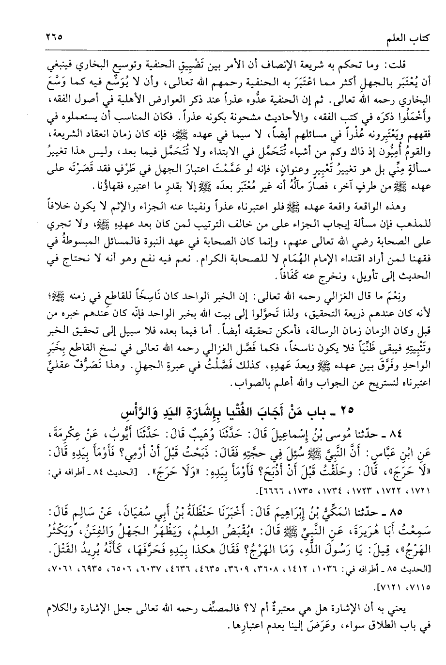 قلت: وما تحكم به شريعة الإنصاف أن الأمر بين تَضْيِيْقِ الحنفية وتوسيعِ البخاري فينبغي أن يُعْتَبَر بالجهلِ أكثر مما اعْتَبَرَ به الحنفية رحمهم الله تعالى، وأن لا يُوَسَّع فيه كما وَسَّعَ البخاري رحمه الله تعالى. ثم إن الحنفية عدُّوه عذرًا عند ذكر عوارض الأهلية في أصول الفقه، وأَخْمَلُوا ذكرَه في كتب الفقه، والأحاديث مشحونة بكونه عذرًا. فكان المناسب أن يستعملوه في فقههم ويَعْتَبِرونه عُذْرًا في مسائلهم أيضًا، لا سيما في عهده صلى الله عليه وسلّم فإنه كان زمان انعقاد الشريعة، والقومُ أُمِيُّون إذ ذاك وكم من أشياء تُتَحَمَّل في الابتداء ولا تُتَحَمَّل فيما بعد، وليس هذا تغييرُ مسألةٍ مِنِّي بل هو تغييرُ تَعْبِيرٍ وعنوانٍ، فإنه لو عَمَّمْتَ اعتبارَ الجهل في ظَرْفٍ فقد قَصَرْتَه على عهده صلى الله عليه وسلّم من طرفٍ آخر، فصارَ مآلُهُ أنه غير مُعْتَبَر بعدَه صلى الله عليه وسلّم إلا بقدرِ ما اعتبره فقهاؤُنا.