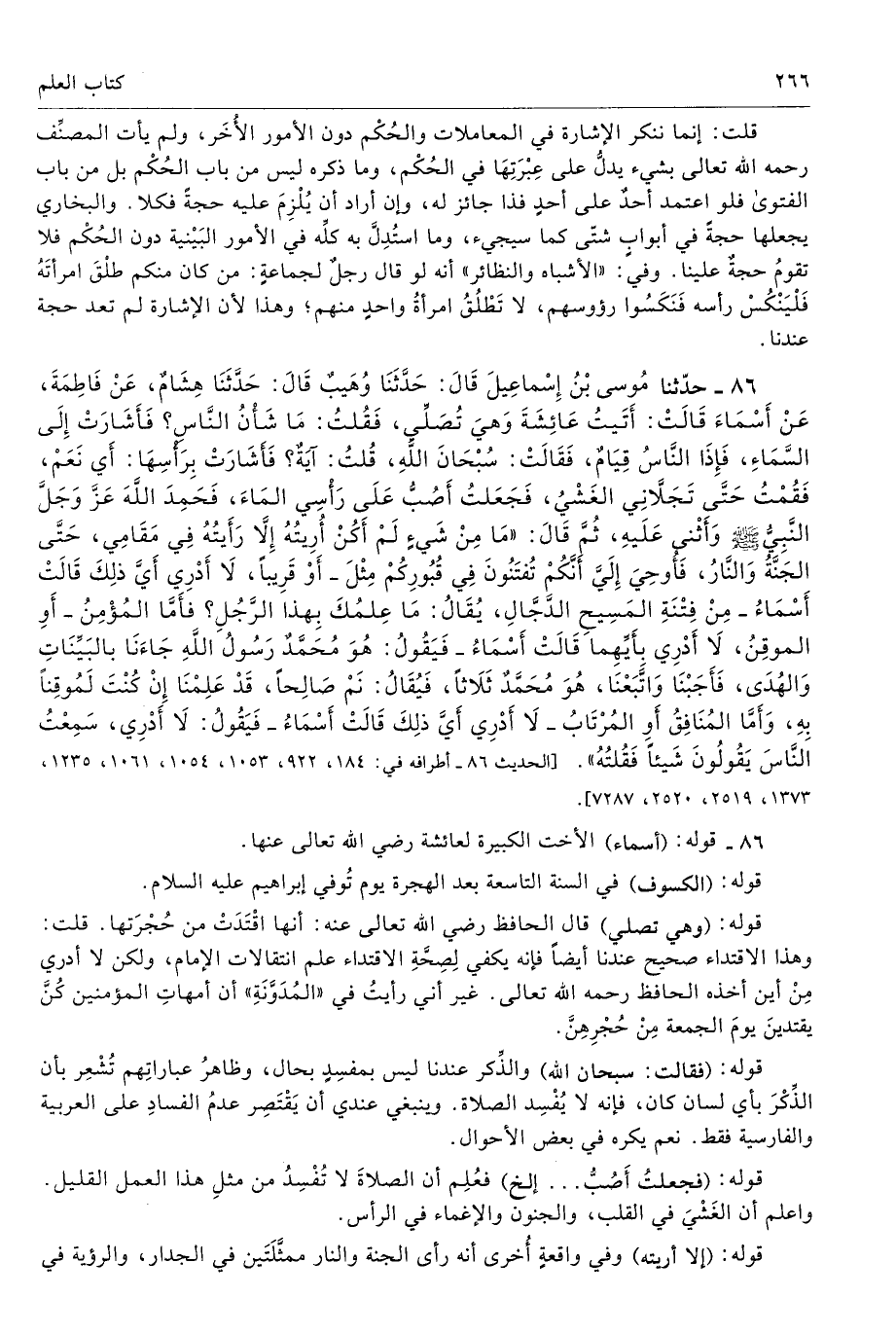 86 - حَدَّثَنَا مُوسَى بْنُ إِسْمَاعِيلَ قَالَ حَدَّثَنَا وُهَيْبٌ قَالَ حَدَّثَنَا هِشَامٌ عَنْ فَاطِمَةَ عَنْ أَسْمَاءَ قَالَتْ أَتَيْتُ عَائِشَةَ وَهِىَ تُصَلِّى فَقُلْتُ مَا شَأْنُ النَّاسِ فَأَشَارَتْ إِلَى السَّمَاءِ، فَإِذَا النَّاسُ قِيَامٌ، فَقَالَتْ سُبْحَانَ اللَّهِ. قُلْتُ آيَةٌ فَأَشَارَتْ بِرَأْسِهَا، أَىْ نَعَمْ، فَقُمْتُ حَتَّى تَجَلاَّنِى الْغَشْىُ، فَجَعَلْتُ أَصُبُّ عَلَى رَأْسِى الْمَاءَ، فَحَمِدَ اللَّهَ عَزَّ وَجَلَّ النَّبِىُّ - صلى الله عليه وسلم - وَأَثْنَى عَلَيْهِ، ثُمَّ قَالَ «مَا مِنْ شَىْءٍ لَمْ أَكُنْ أُرِيتُهُ إِلاَّ رَأَيْتُهُ فِى مَقَامِى حَتَّى الْجَنَّةَ وَالنَّارَ، فَأُوحِىَ إِلَىَّ أَنَّكُمْ تُفْتَنُونَ فِى قُبُورِكُمْ، مِثْلَ - أَوْ قَرِيبًا لاَ أَدْرِى أَىَّ ذَلِكَ قَالَتْ أَسْمَاءُ - مِنْ فِتْنَةِ الْمَسِيحِ الدَّجَّالِ، يُقَالُ مَا عِلْمُكَ بِهَذَا الرَّجُلِ فَأَمَّا الْمُؤْمِنُ - أَوِ الْمُوقِنُ لاَ أَدْرِى بِأَيِّهِمَا قَالَتْ أَسْمَاءُ - فَيَقُولُ هُوَ مُحَمَّدٌ رَسُولُ اللَّهِ جَاءَنَا بِالْبَيِّنَاتِ وَالْهُدَى، فَأَجَبْنَا وَاتَّبَعْنَا، هُوَ مُحَمَّدٌ. ثَلاَثًا، فَيُقَالُ نَمْ صَالِحًا، قَدْ عَلِمْنَا إِنْ كُنْتَ لَمُوقِنًا بِهِ، وَأَمَّا الْمُنَافِقُ - أَوِ الْمُرْتَابُ لاَ أَدْرِى أَىَّ ذَلِكَ قَالَتْ أَسْمَاءُ - فَيَقُولُ لاَ أَدْرِى، سَمِعْتُ النَّاسَ يَقُولُونَ شَيْئًا فَقُلْتُهُ». أطرافه 184، 922، 1053، 1054، 1061، 1235، 1373، 2519، 2520، 7287 - تحفة 15750 - 32/ 1