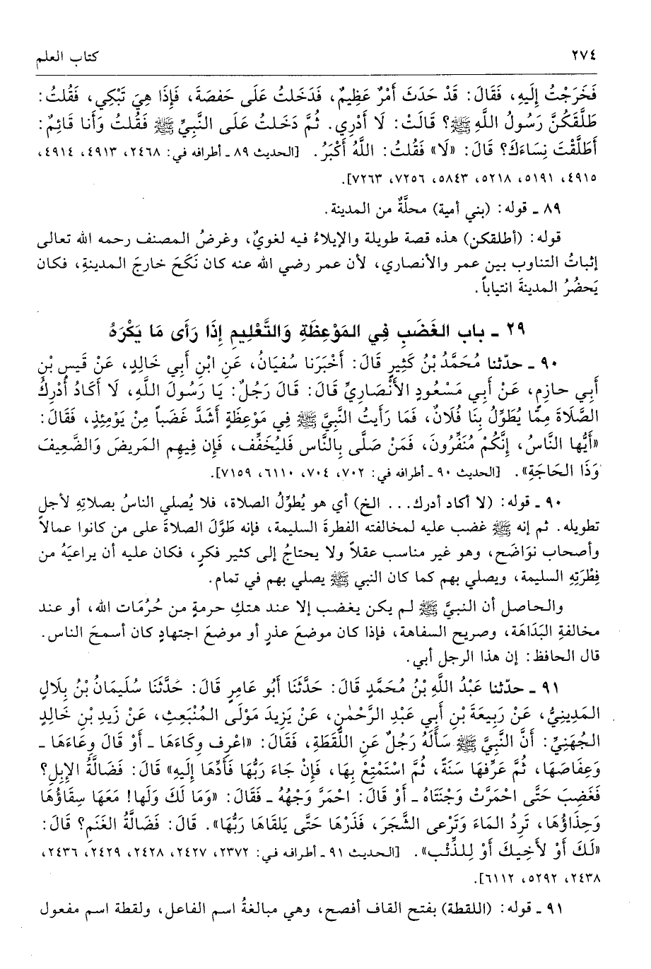 91 - حَدَّثَنَا عَبْدُ اللَّهِ بْنُ مُحَمَّدٍ قَالَ حَدَّثَنَا أَبُو عَامِرٍ قَالَ حَدَّثَنَا سُلَيْمَانُ بْنُ بِلاَلٍ الْمَدِينِىُّ عَنْ رَبِيعَةَ بْنِ أَبِى عَبْدِ الرَّحْمَنِ عَنْ يَزِيدَ مَوْلَى الْمُنْبَعِثِ عَنْ زَيْدِ بْنِ خَالِدٍ الْجُهَنِىِّ أَنَّ النَّبِىَّ - صلى الله عليه وسلم - سَأَلَهُ رَجُلٌ عَنِ اللُّقَطَةِ فَقَالَ «اعْرِفْ وِكَاءَهَا - أَوْ قَالَ وِعَاءَهَا - وَعِفَاصَهَا، ثُمَّ عَرِّفْهَا سَنَةً، ثُمَّ اسْتَمْتِعْ بِهَا، فَإِنْ جَاءَ رَبُّهَا فَأَدِّهَا إِلَيْهِ». قَالَ فَضَالَّةُ الإِبِلِ فَغَضِبَ حَتَّى احْمَرَّتْ وَجْنَتَاهُ - أَوْ قَالَ احْمَرَّ وَجْهُهُ - فَقَالَ «وَمَا لَكَ وَلَهَا مَعَهَا سِقَاؤُهَا وَحِذَاؤُهَا، تَرِدُ الْمَاءَ، وَتَرْعَى الشَّجَرَ، فَذَرْهَا حَتَّى يَلْقَاهَا رَبُّهَا». قَالَ فَضَالَّةُ الْغَنَمِ قَالَ «لَكَ أَوْ لأَخِيكَ أَوْ لِلذِّئْبِ». أطرافه 2372، 2427، 2428، 2429، 2436، 2438، 5292، 6112 - تحفة 3763