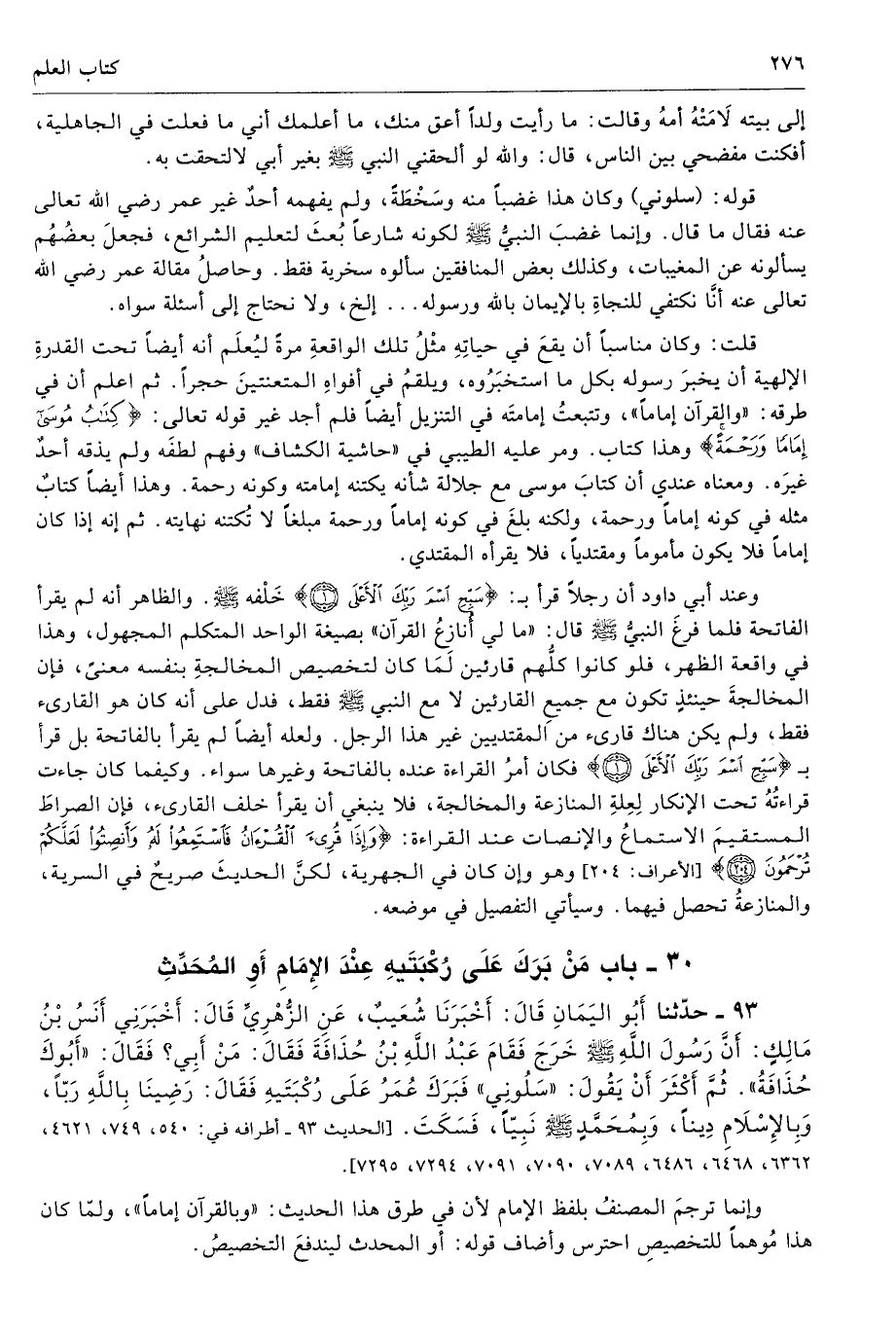 قلت: وكان مناسبًا أن يقعَ في حياتِهِ مثْلُ تلك الواقعةِ مرةً ليُعلَم أنه أيضًا تحت القدرةِ الإلهية أن يخبرَ رسوله بكل ما استخبَرُوه، ويلقمُ في أفواهِ المتعنتينَ حجرًا. ثم اعلم أن في طرقه: «والقرآن إمامًا»، وتتبعتُ إمامتَه في التنزيل أيضًا فلم أجد غير قوله تعالى: {كِتَابُ مُوسَى إَمَامًا وَرَحْمَةً} وهذا كتاب. ومر عليه الطيبي في «حاشية الكشاف» وفهم لطفَه ولم يذقه أحدٌ غيرَه. ومعناه عندي أن كتابَ موسى مع جلالة شأنه يكتنه إمامته وكونه رحمة. وهذا أيضًا كتابٌ مثله في كونه إمامًا ورحمة، ولكنه بلغَ في كونه إمامًا ورحمة مبلغًا لا تُكتنه نهايته. ثم إنه إذا كان إمامًا فلا يكون مأمومًا ومقتديًا، فلا يقرأه المقتدي.