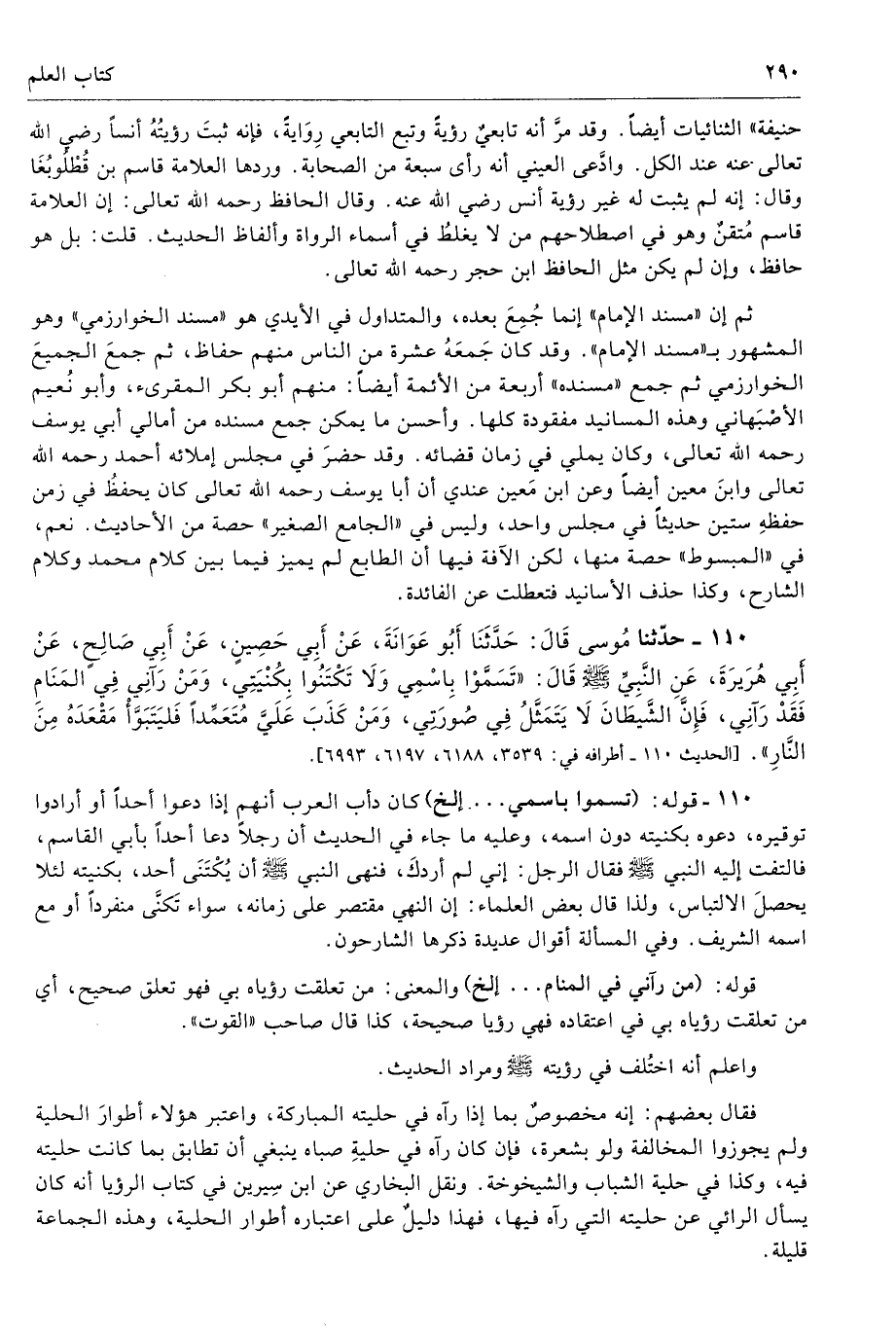 110 - قوله: (تسموا باسمي ... إلخ) كان دأب العرب أنهم إذا دعوا أحد أو أرادوا توقيره، دعوه بكنيته دون اسمه، وعليه ما جاء في الحديث أن رجلًا دعا أحدًا بأبي القاسم، فالتفت إليه النبي صلى الله عليه وسلّم فقال الرجل: إني لم أردكَ، فنهى النبي صلى الله عليه وسلّم أن يُكْتَنَى أحد، يكنيته لئلا يحصلَ الالتباس، ولذا قال بعض العلماء: إن النهى مقتصر على زمانه، سواء تَكنَّى منفردًا أو مع اسمه الشريف. وفي المسألة أقوال عديدة ذكرها الشارحون.