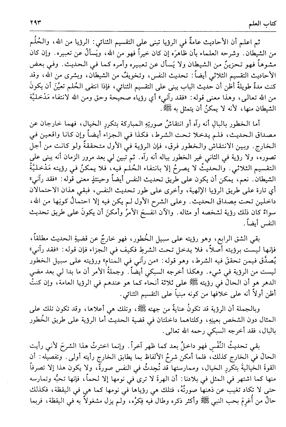 أما الحظورُ بالبالِ أنه رآه أو انتقاشُ صورتِهِ المباكرة بتكررِ الخيال، فهما خارجان عن مصداق الحديث، فلم يدخلا تحت الشرط، فكذا في الجزاء أيضًا وإن كانا واقعين في الخارج. وبين الانتقاش والخطور فرق، فإن الرؤية في الأول متحققةٌ ولو كانت من أجل تصوره، ولا رؤية في الثاني غير الخطور بباله أنه رآه. ثم تبين لي بعد مرور الزمان أنه ينبىء عن التقسيم الثلاثي. والحديثُ لا يصرحُ إلا بانتفاء الحُلم فيه، فلا يمكنُ في رؤيته مَدْخليَّةُ الشيطان. نعم، يمكن أن يكون على طريق تحديث النفس أيضًا وحينئذٍ معنى قوله: «فقد رآني» أي تارة على طريق الرؤيا الإلهية، وأخرى على طور تحديث النفس، فبقي هذان الاحتمالان داخلين تحت مِصداق الحديث. وعلى الشرح الأول لم يكن فيه ألا احتمالُ كونِها من الله، سواءٌ كان ذلك رؤية لشخصه أو مثاله. والآن انفسحَ الأمرُ وأمكنَ أن يكونَ على طريق تحديث النفس أيضًا.