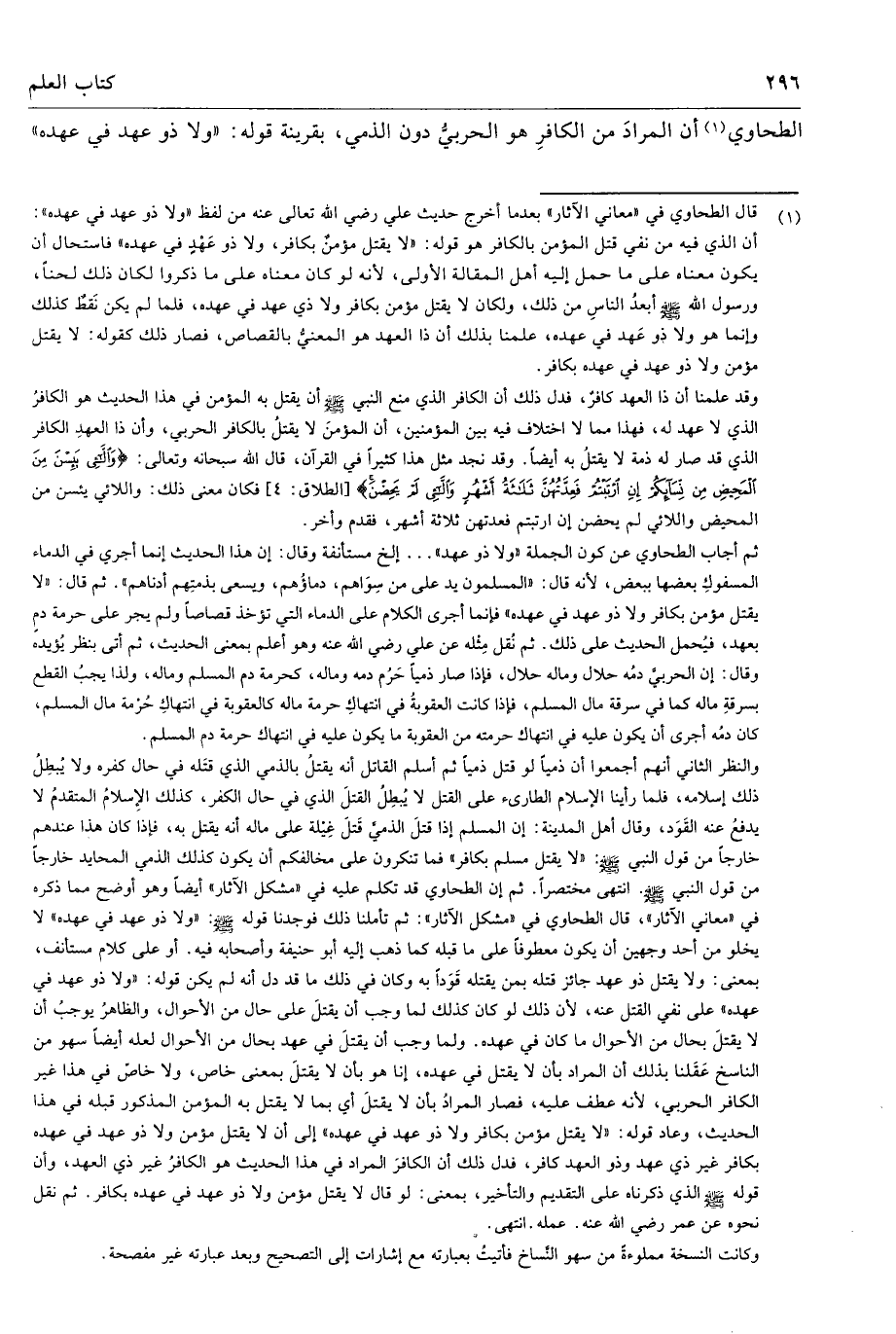 وقد علمنا أن ذا العهد كافرٌ، فدل ذلك أن الكافر الذي منع النبي - صلى الله عليه وسلم - أن يقتل به المؤمن في هذا الحديث هو الكافرُ الذي لا عهد له، فهذا مما لا اختلاف فيه بين المؤمنين، أن المؤمنَ لا يقتلُ بالكافر الحربي، وأن ذا العهدِ الكافر الذي قد صار له ذمة لا يقتلُ به أيضًا. وقد نجد مثل هذا كثيرًا في القرآن، قال الله سبحانه وتعالى: {وَاللَّائِي يَئِسْنَ مِنَ الْمَحِيضِ مِنْ نِسَائِكُمْ إِنِ ارْتَبْتُمْ فَعِدَّتُهُنَّ ثَلَاثَةُ أَشْهُرٍ وَاللَّائِي لَمْ يَحِضْنَ} [الطلاق: 4] فكان معنى ذلك: واللائي يئسن من المحيض واللائي لم يحضن إن ارتبتم فعدتهن ثلاثة أشهر، فقدم وأخر.
