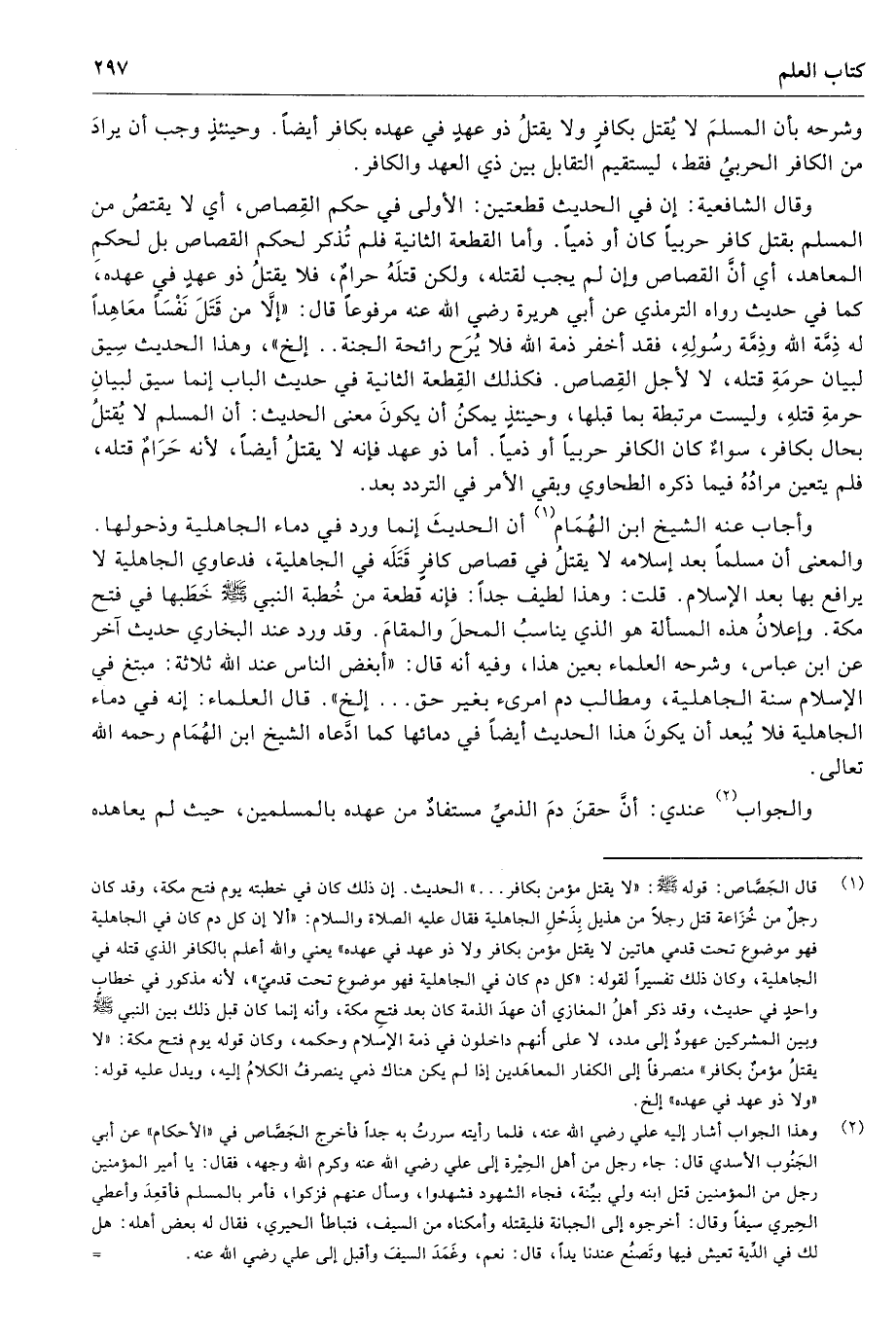 (¬2) وهذا الجواب أشار إليه علي رضي الله عنه، فلما رأيته سررتُ به جدًا فأخرج الجَصَّاص في "الأحكام" عن أبي الجَنُوب الأسدي قال: جاء رجل من أهل الحِيْرة إلى علي رضي الله عنه وكرم الله وجهه، فقال: يا أمير المؤمنين رجل من المؤمنين قتل ابنه ولي بيِّنة، فجاء الشهود فشهدوا، وسأل عنهم فزكوا، فأمر بالمسلم فأقعِدَ وأعطي الحِيري سيفًا وقال: أخرجوه إلى الجبانة فليقتله وأمكناه من السيف، فتباطأ الحيري، فقال له بعض أهله: هل لك في الدِّية تعيش فيها وتَصنُع عندنا يدًا، قال: نعم، وغَمَدَ السيفَ وأقبل إلى علي رضي الله عنه. =