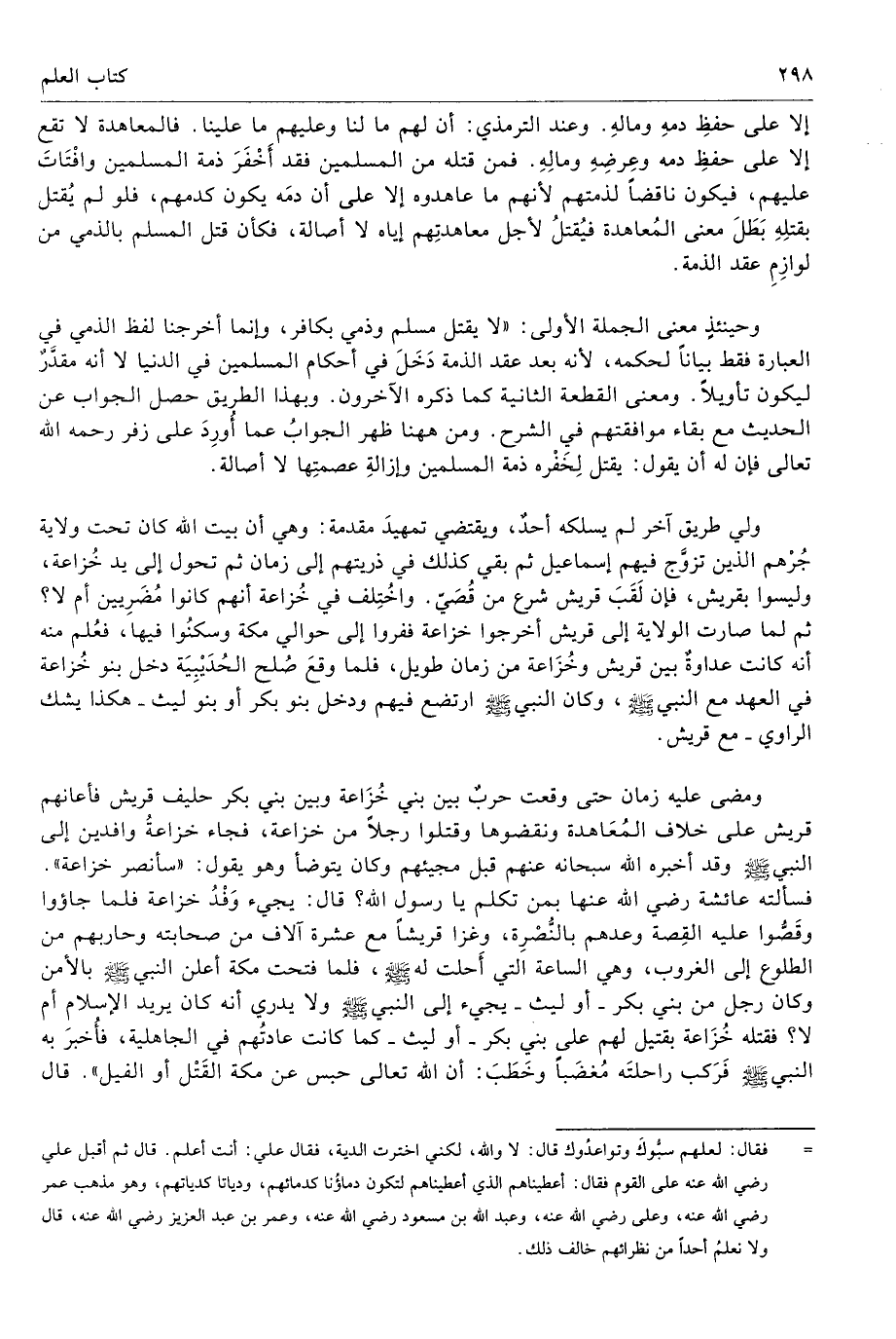 وحينئذٍ معنى الجملة الأولى: «لا يقتل مسلم وذمي بكافر، وإنما أخرجنا لفظ الذمي في العبارة فقد بيانًا لحكمه، لأنه بعد عقد الذمة دَخَلَ في أحكام المسلمين في الدنيا لا أنه مقدَّرٌ ليكون تأويلًا. ومعنى القطعة الثانية كما ذكره الآخرون. وبهذا الطريق حصل الجواب عن الحديث مع بقاء موافقتهم في الشرح. ومن ههنا ظهر الجوابُ عما أُورِدَ على زفر رحمه الله تعالى فإن له أن يقول: يقتل لِخَفْره ذمة المسلمين وإزالةِ عصمتِها لا أصالة.
