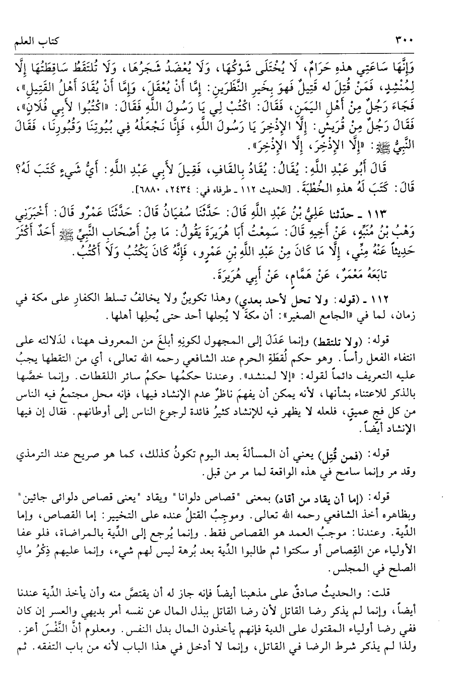 وَإِنَّهَا سَاعَتِى هَذِهِ حَرَامٌ، لاَ يُخْتَلَى شَوْكُهَا، وَلاَ يُعْضَدُ شَجَرُهَا، وَلاَ تُلْتَقَطُ سَاقِطَتُهَا إِلاَّ لِمُنْشِدٍ، فَمَنْ قُتِلَ فَهُوَ بِخَيْرِ النَّظَرَيْنِ إِمَّا أَنْ يُعْقَلَ، وَإِمَّا أَنْ يُقَادَ أَهْلُ الْقَتِيلِ». فَجَاءَ رَجُلٌ مِنْ أَهْلِ الْيَمَنِ فَقَالَ اكْتُبْ لِى يَا رَسُولَ اللَّهِ. فَقَالَ «اكْتُبُوا لأَبِى فُلاَنٍ». فَقَالَ رَجُلٌ مِنْ قُرَيْشٍ إِلاَّ الإِذْخِرَ يَا رَسُولَ اللَّهِ، فَإِنَّا نَجْعَلُهُ فِى بُيُوتِنَا وَقُبُورِنَا. فَقَالَ النَّبِىُّ - صلى الله عليه وسلم - «إِلاَّ الإِذْخِرَ، إِلاَّ الإِذْخِرَ».