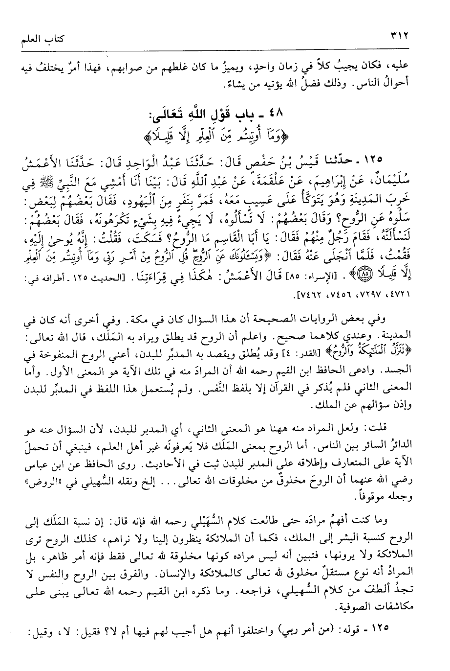125 - حَدَّثَنَا قَيْسُ بْنُ حَفْصٍ قَالَ حَدَّثَنَا عَبْدُ الْوَاحِدِ قَالَ حَدَّثَنَا الأَعْمَشُ سُلَيْمَانُ عَنْ إِبْرَاهِيمَ عَنْ عَلْقَمَةَ عَنْ عَبْدِ اللَّهِ قَالَ بَيْنَا أَنَا أَمْشِى مَعَ النَّبِىِّ - صلى الله عليه وسلم - فِى خَرِبِ الْمَدِينَةِ، وَهُوَ يَتَوَكَّأُ عَلَى عَسِيبٍ مَعَهُ، فَمَرَّ بِنَفَرٍ مِنَ الْيَهُودِ، فَقَالَ بَعْضُهُمْ لِبَعْضٍ سَلُوهُ عَنِ الرُّوحِ. وَقَالَ بَعْضُهُمْ لاَ تَسْأَلُوهُ لاَ يَجِىءُ فِيهِ بِشَىْءٍ تَكْرَهُونَهُ. فَقَالَ بَعْضُهُمْ لَنَسْأَلَنَّهُ. فَقَامَ رَجُلٌ مِنْهُمْ فَقَالَ يَا أَبَا الْقَاسِمِ، مَا الرُّوحُ فَسَكَتَ. فَقُلْتُ إِنَّهُ يُوحَى إِلَيْهِ. فَقُمْتُ، فَلَمَّا انْجَلَى عَنْهُ فقَالَ {وَيَسْأَلُونَكَ عَنِ الرُّوحِ قُلِ الرُّوحُ مِنْ أَمْرِ رَبِّي وَمَا أُوتِيتُمْ مِنَ الْعِلْمِ إِلَّا قَلِيلًا (85)} [الإسراء: 85]. قَالَ الأَعْمَشُ هَكَذَا فِى قِرَاءَتِنَا. أطرافه 4721، 7297، 7456، 7462 - تحفة 9419