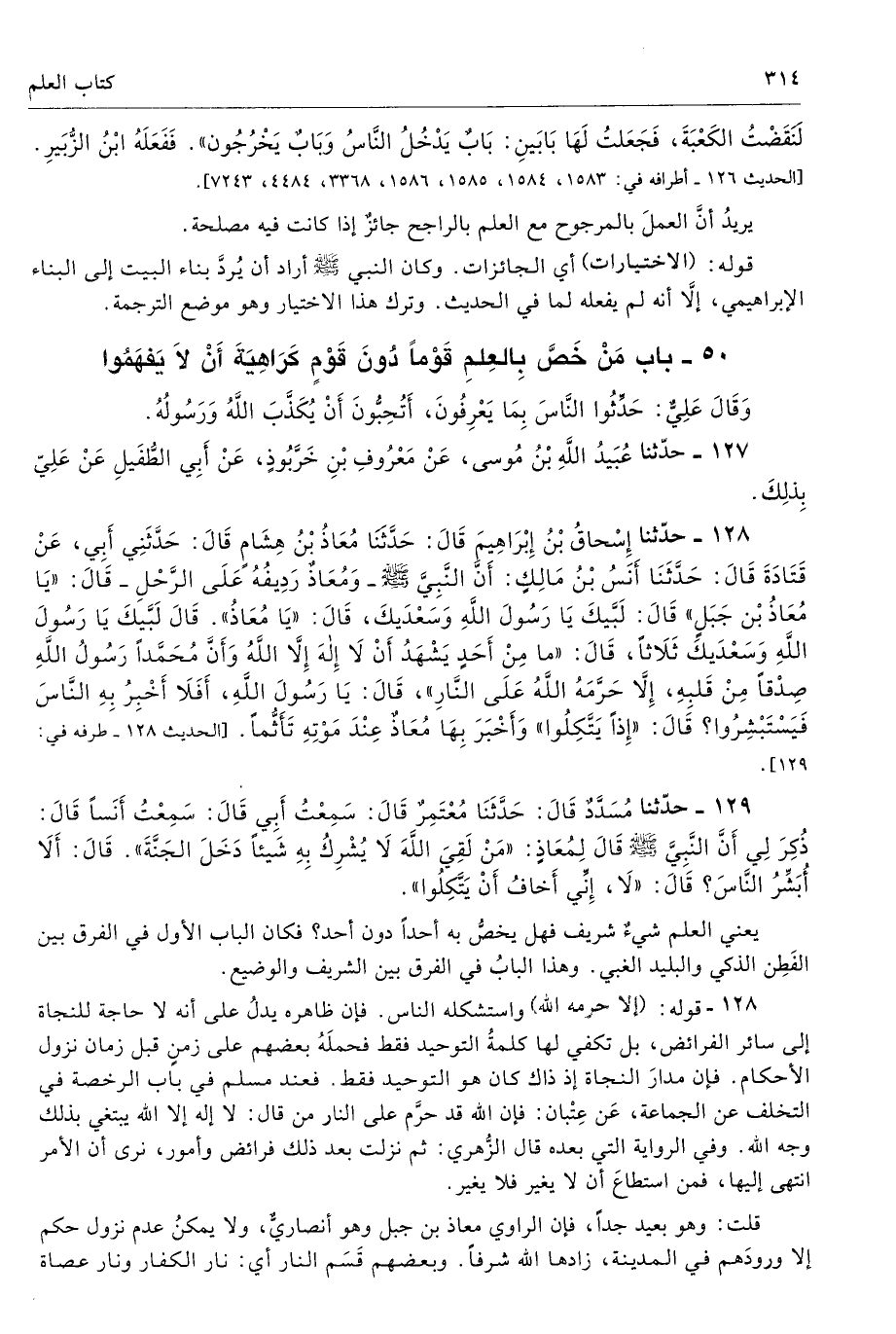 129 - حَدَّثَنَا مُسَدَّدٌ قَالَ حَدَّثَنَا مُعْتَمِرٌ قَالَ سَمِعْتُ أَبِى قَالَ سَمِعْتُ أَنَسًا قَالَ ذُكِرَ لِى أَنَّ النَّبِىَّ - صلى الله عليه وسلم - قَالَ لِمُعَاذٍ «مَنْ لَقِىَ اللَّهَ لاَ يُشْرِكُ بِهِ شَيْئًا دَخَلَ الْجَنَّةَ». قَالَ أَلاَ أُبَشِّرُ النَّاسَ قَالَ «لاَ، إِنِّى أَخَافُ أَنْ يَتَّكِلُوا». طرفه 128 - تحفة 885، 15531 أ