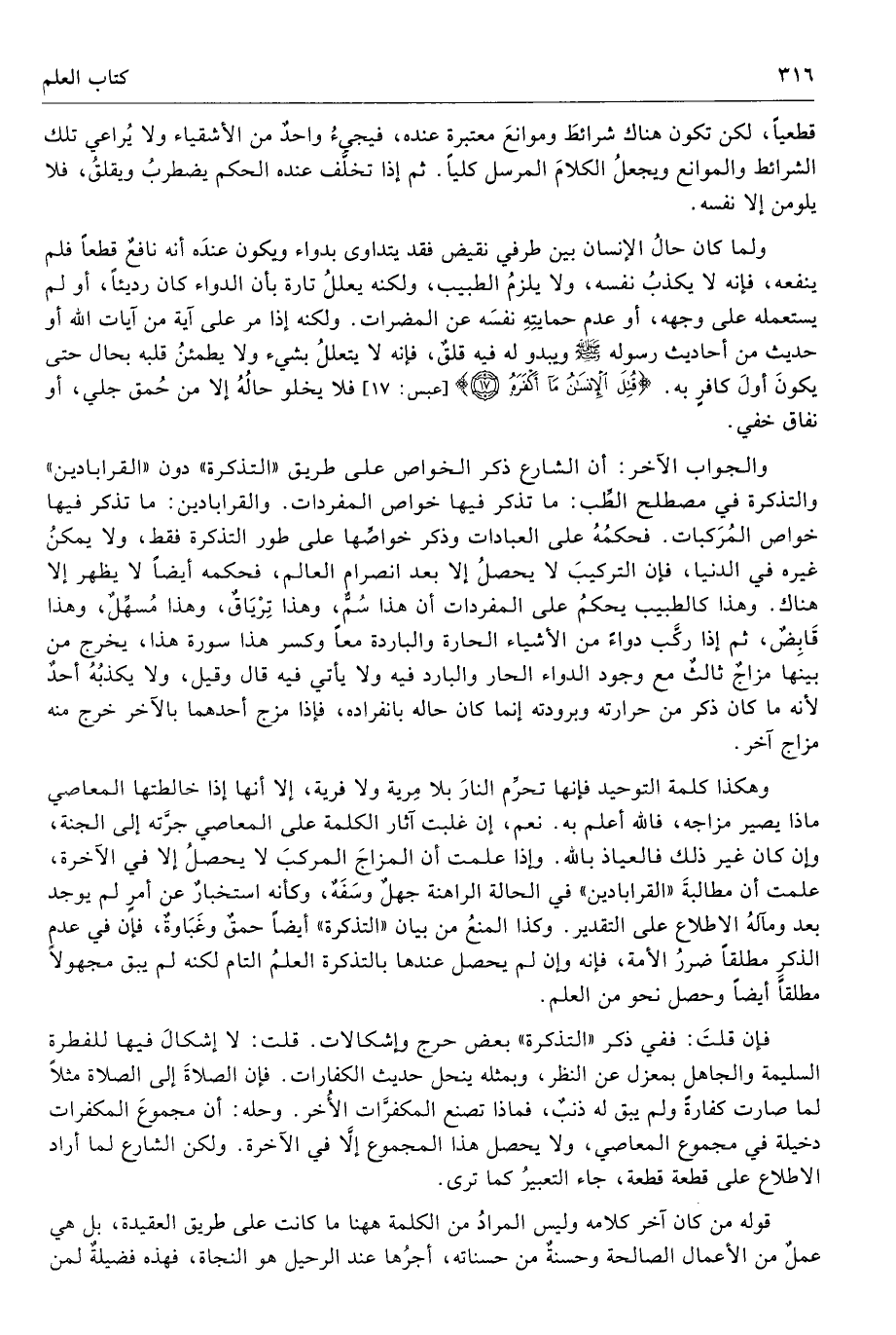 وهكذا كلمة التوحيد فإنها تحرِّم النارَ بلا مِرية ولا فرية، إلا أنها إذا خالطتها المعاصي ماذا يصير مزاجه، فالله أعلم به. نعم، إن غلبت آثار الكلمة على المعاصي جرَّته إلى الجنة، وإن كان غير ذلك فالعياذ بالله. وإذا علمت أن المزاجَ المركبَ لا يحصلُ إلا في الآخرة، علمت أن مطالبةَ «القرابادين» في الحالة الراهنة جهلٌ وسَفَهٌ، وكأنه استخبارٌ عن أمرٍ لم يوجد بعد ومآلهُ الاطلاع على التقدير. وكذا المنعُ من بيان «التذكرة» أيضًا حمقٌ وغَبَاوةٌ، فإن في عدم الذكرِ مطلقًا ضررُ الأمة، فإنه وإن لم يحصل عندها بالتذكرة العلمُ التام لكنه لم يبق مجهولًا مطلقًا أيضًا وحصل نحو من العلم.