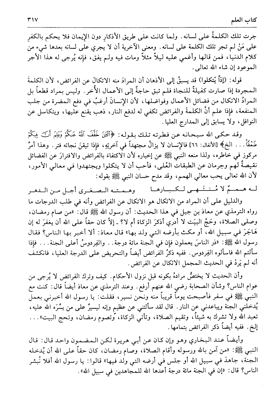 وأن الحديث لا يختصُّ مرادهُ بكونه قبل نزول الأحكام. كيف وترك الفرائض لا يُرجى من عوام الناس؟ شأن الصحابة رضي الله عنهم أرفع. وعند الترمذي عن معاذ أيضًا قال: كنت مع النبي صلى الله عليه وسلّم في سفر فأصبحت يومًا قريبًا منه نحن نسير، فقلت: يا رسول الله أخبرني بعمل يُدخلني الجنة ويباعدني عن النار. قال لقد سألتني عن عظيمٍ وإنه ليسيرٌ على من يسَّرَه الله عليه، تعبد الله ولا تشرك به شيئًا، وتقيم الصلاة، وتأتي الزكاة، وتصوم رمضان، وتحج البيت» ... إلخ. ففيه أيضًا ذكر الفرائض بتمامها.