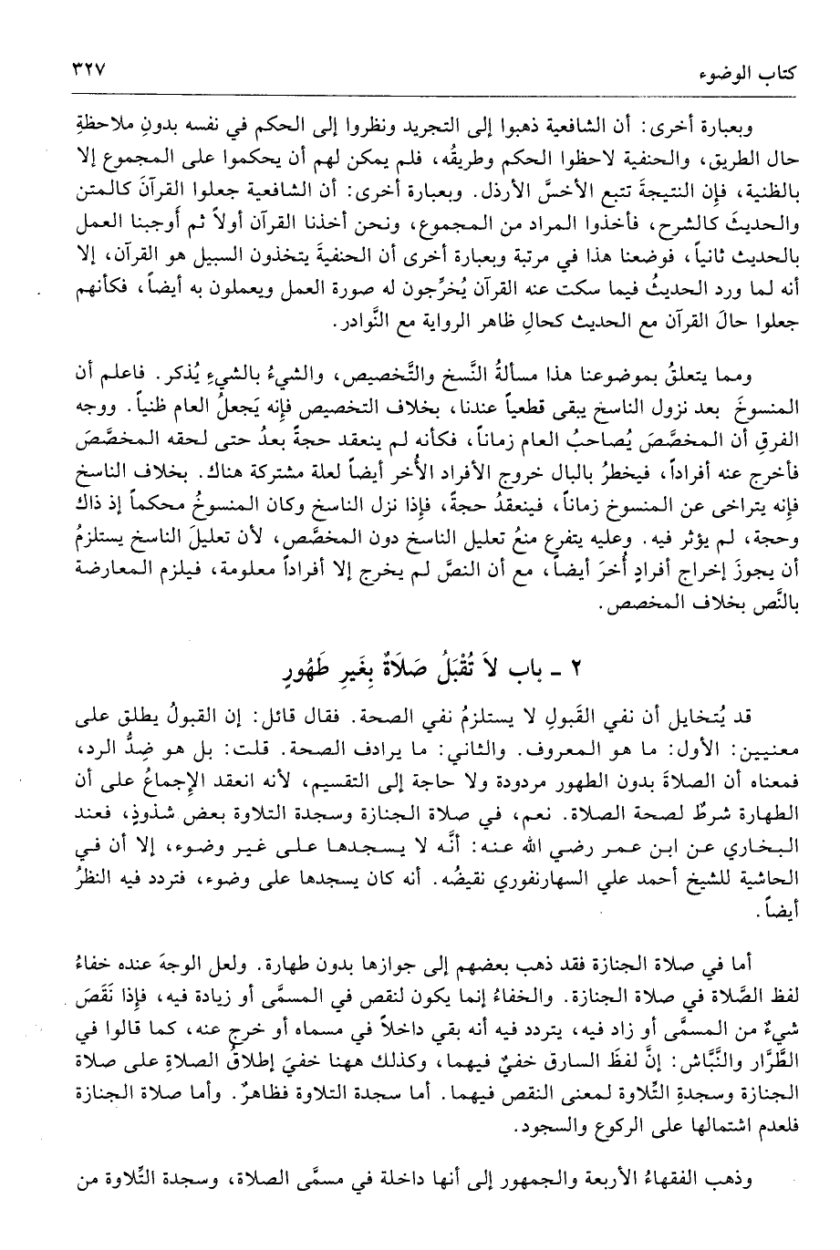 قد يُتخايل أن نفي القَبولِ لا يستلزمُ نفي الصحة. فقال قائل: إن القبولُ يطلق على معنيين: الأول: ما هو المعروف. والثاني: ما يرادف الصحة. قلت: بل هو ضِدُّ الرد، فمنعناه أن الصلاةَ بدون الطهور مردودة ولا حاجة إلى التقسيم، لأنه انعقد الإِجماعُ على أن الطهارة شرطٌ لصحة الصلاة. نعم، في صلاة الجنازة وسجدة التلاوة بعض شذوذٍ، فعند البخاري عن ابن عمر رضي الله عنه: أنَّه لا يسجدها على غير وضوء، إلا أن في الحاشية للشيخ أحمد علي السهارنفوري نقيضُه. أنه كان يسجدها على وضوء، فتردد فيه النظرُ أيضًا.