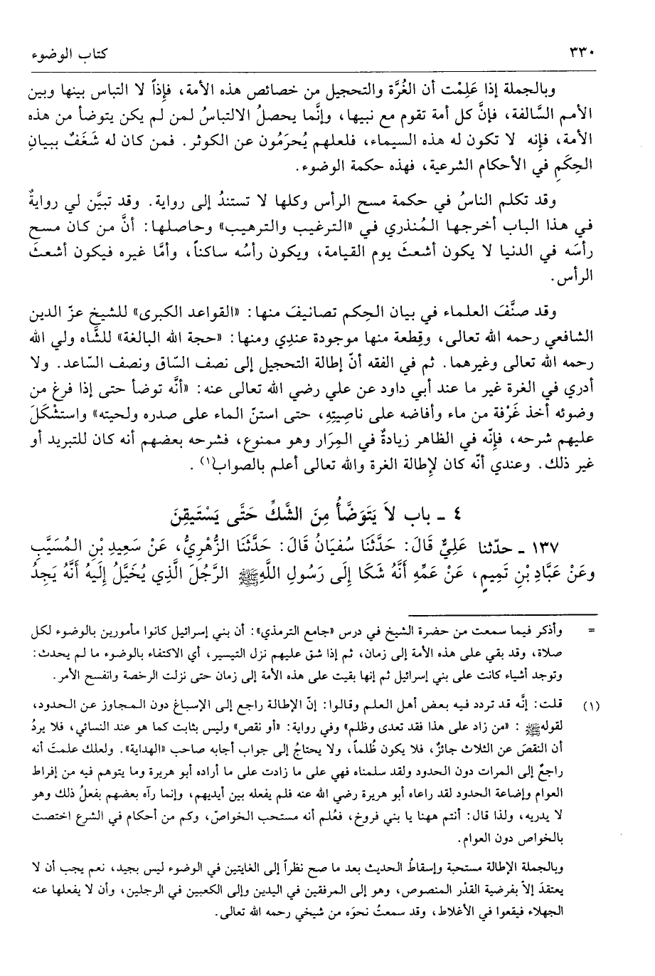 وقد صنَّفَ العلماء في بيان الحِكم تصانيفَ منها: «القواعد الكبرى» للشيخ عزّ الدين الشافعي رحمه الله تعالى، وقِطعة منها موجودة عندِي ومنها: «حجة الله البالغة» للشَّاه ولي الله رحمه الله تعالى وغيرهما. ثم في الفقه إنّ إطالة التحجيل إلى نصف السّاق ونصف السّاعد. ولا أدري في الغرة غير ما عند أبي داود عن علي رضي الله تعالى عنه: «أنَّه توضأ حتى إذا فرغ من وضوئه أخذ غَرْفة من ماء وأفاضه على ناصِيتَهِ، حتى استنّ الماء على صدره ولحيته» واستشْكَلَ عليهم شرحه، فإِنّه في الظاهر زيادةٌ في المِرَار وهو ممنوع، فشرحه بعضهم أنه كان للتبريد أو غير ذلك. وعندي أنّه كان لإِطالة الغرة والله تعالى أعلم بالصواب (¬1).
