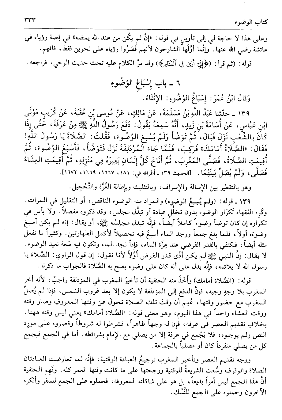 139 - حَدَّثَنَا عَبْدُ اللَّهِ بْنُ مَسْلَمَةَ عَنْ مَالِكٍ عَنْ مُوسَى بْنِ عُقْبَةَ عَنْ كُرَيْبٍ مَوْلَى ابْنِ عَبَّاسٍ عَنْ أُسَامَةَ بْنِ زَيْدٍ أَنَّهُ سَمِعَهُ يَقُولُ دَفَعَ رَسُولُ اللَّهِ - صلى الله عليه وسلم - مِنْ عَرَفَةَ حَتَّى إِذَا كَانَ بِالشِّعْبِ نَزَلَ فَبَالَ، ثُمَّ تَوَضَّأَ وَلَمْ يُسْبِغِ الْوُضُوءَ. فَقُلْتُ الصَّلاَةَ يَا رَسُولَ اللَّهِ. فَقَالَ «الصَّلاَةُ أَمَامَكَ». فَرَكِبَ، فَلَمَّا جَاءَ الْمُزْدَلِفَةَ نَزَلَ فَتَوَضَّأَ، فَأَسْبَغَ الْوُضُوءَ، ثُمَّ أُقِيمَتِ الصَّلاَةُ فَصَلَّى الْمَغْرِبَ، ثُمَّ أَنَاخَ كُلُّ إِنْسَانٍ بَعِيرَهُ فِى مَنْزِلِهِ، ثُمَّ أُقِيمَتِ الْعِشَاءُ فَصَلَّى وَلَمْ يُصَلِّ بَيْنَهُمَا. أطرافه 181، 1667، 1669، 1672 - تحفة 115