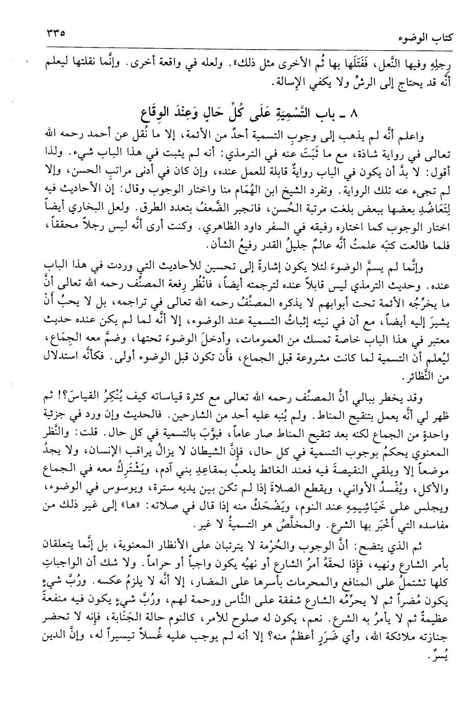 واعلم أنَّه لم يذهب إلى وجوبِ التسمية أحدٌ من الأئمة، إلا ما نُقل عن أحمد رحمه الله تعالى في رواية شاذة، مع ما ثَبَتَ عنه في الترمذي: أنه لم يثبت في هذا الباب شيء. ولذا أقول: لا بدَّ أن يكون في الباب روايةٌ قابلة للعمل عنده، وإن كان في أدنى مراتبِ الحسن، وإلا لم تجىء عنه تلك الرواية. وتفرد الشيخ ابن الهُمَام منا واختار الوجوب وقال: إن الأحاديث فيه لِتَعَاضُدِ بعضها ببعض بلغت مرتبة الحُسن، فانجبر الضَّعفُ بتعدد الطرق. ولعل البخاري أيضًا اختار الوجوب كما اختاره رفيقه في السفر داود الظاهري. وكنت أرى أنَّه ليس رجلًا محققًا، فلما طالعت كتبَه علمتُ أنَّه عالمٌ جليلُ القدر رفيعُ الشأن.