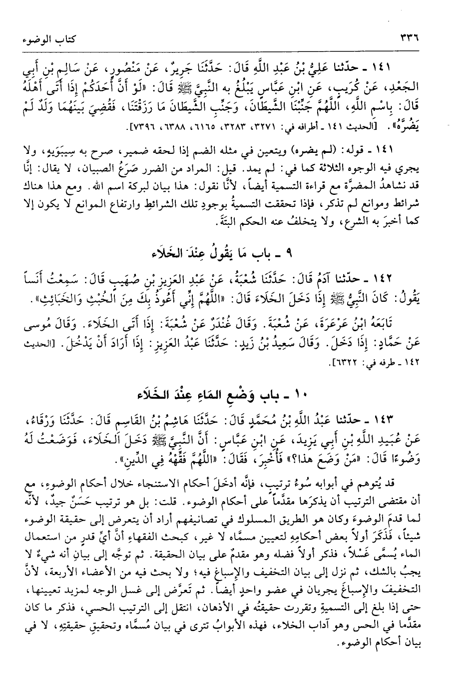 143 - حَدَّثَنَا عَبْدُ اللَّهِ بْنُ مُحَمَّدٍ قَالَ حَدَّثَنَا هَاشِمُ بْنُ الْقَاسِمِ قَالَ حَدَّثَنَا وَرْقَاءُ عَنْ عُبَيْدِ اللَّهِ بْنِ أَبِى يَزِيدَ عَنِ ابْنِ عَبَّاسٍ أَنَّ النَّبِىَّ - صلى الله عليه وسلم - دَخَلَ الْخَلاَءَ، فَوَضَعْتُ لَهُ وَضُوءًا قَالَ «مَنْ وَضَعَ هَذَا». فَأُخْبِرَ فَقَالَ «اللَّهُمَّ فَقِّهْهُ فِى الدِّينِ». أطرافه 75، 3756، 7270 - تحفة 5865