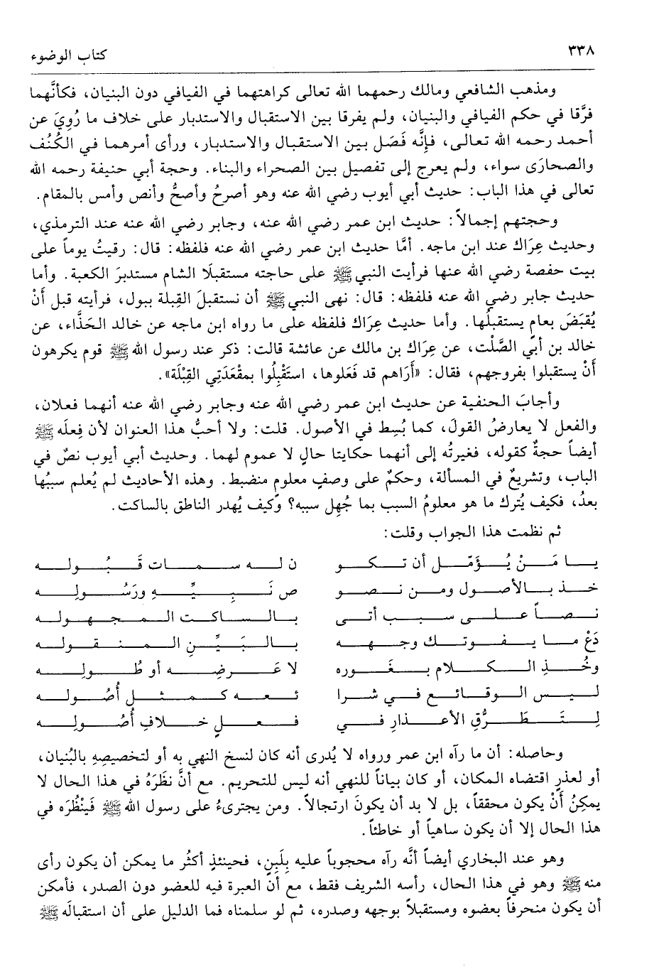 وأجابَ الحنفية عن حديث ابن عمر رضي الله عنه وجابر رضي الله عنه أنهما فعلان، والفعل لا يعارضُ القولَ، كما بُسِط في الأصول. قلت: ولا أحبُّ هذا العنوان لأن فِعلَه صلى الله عليه وسلّم أيضًا حجةٌ كقوله، فغيرتُه إلى أنهما حكايتا حالٍ لا عموم لهما. وحديث أبي أيوب نصٌ في الباب، وتشريعٌ في المسألة، وحكمٌ على وصفٍ معلومٍ منضبط. وهذه الأحاديث لم يُعلم سببُها بعدُ، فكيف يُترك ما هو معلومُ السبب بما جُهِل سببه؟ وكيف يُهدر الناطق بالساكت.