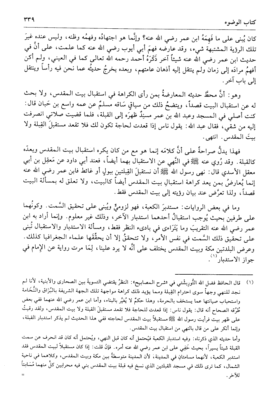 وهو: أنَّ محطَّ حديثه المعارضةُ بمن رأى الكراهة في استقبال بيت المقدس، ولا بحث له عن استقبال البيت قصدًا، ويتضحُ ذلك من سياقٍ سَاقه مسلمٌ عن عمه واسع بن حَبان قال: كنت أصلي في المسجد وعبد الله بن عمر مسنِدٌ ظهرَه إلى القبلة، فلما قضيت صلاتي انصرفت إليه من شقي، فقال عبد الله: يقول ناس إذا قعدت لحاجة تكون لك فلا تقعد مستقبلَ القِبلة ولا بيتَ المقدس. انتهى.