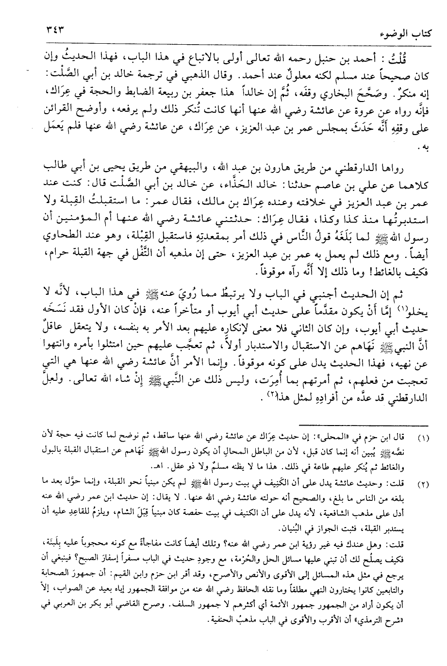 (¬1) قال ابن حزم في "المحلى": إن حديث عِرَاك عن عائشة رضي الله عنها ساقط، ثم نوضح لما كانت فيه حجة لأن نصَّه - صلى الله عليه وسلم - يُبين أنه إنما كان قبل، لأن من الباطل المحالِ أن يكون رسول الله - صلى الله عليه وسلم - نَهَاهم عن استقبال القبلة بالبول والغائط ثم يُنكر عليهم طاعة في ذلك. هذا ما لا يظنه مسلمٌ ولا ذو عقل. اهـ.