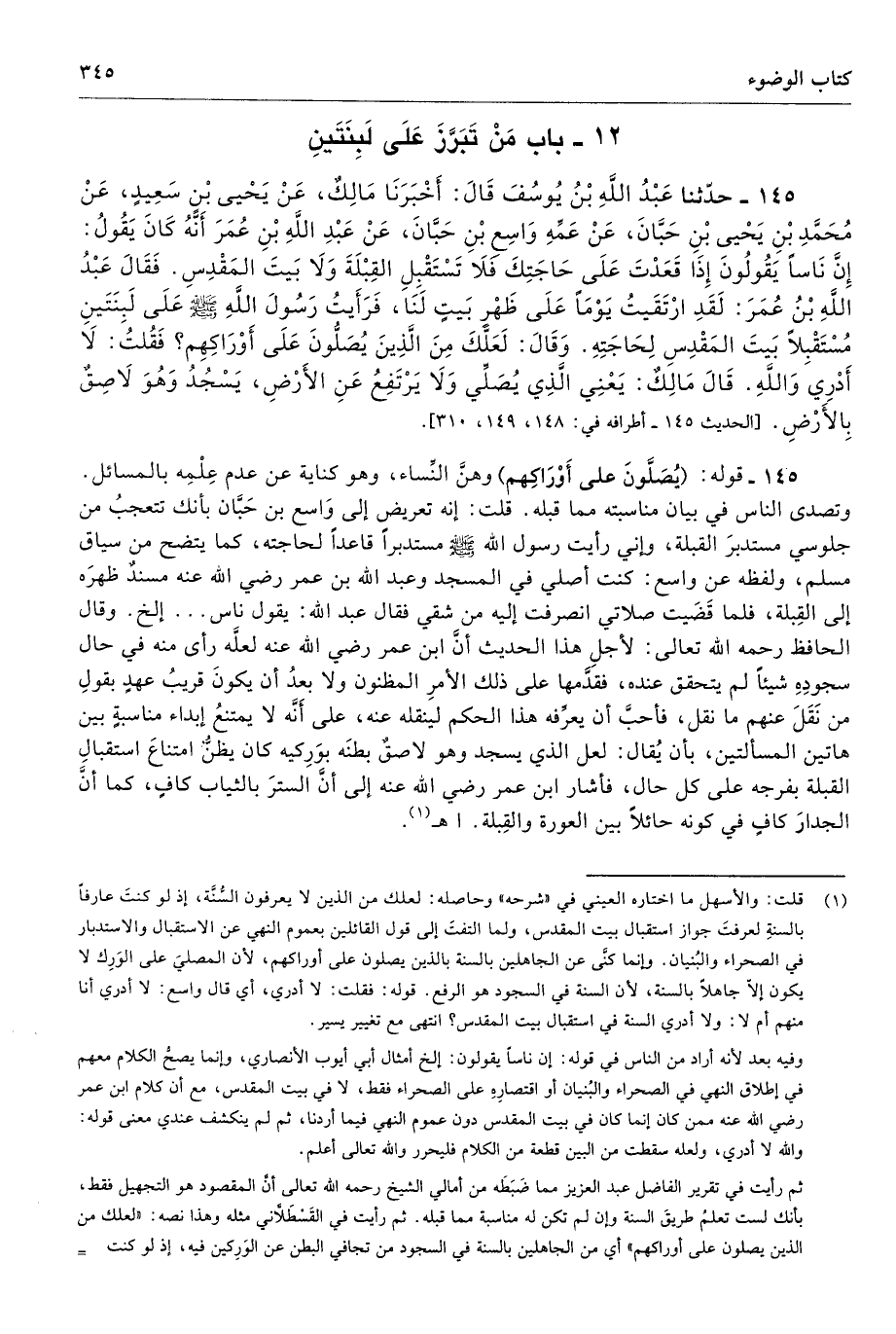 145 - حَدَّثَنَا عَبْدُ اللَّهِ بْنُ يُوسُفَ قَالَ أَخْبَرَنَا مَالِكٌ عَنْ يَحْيَى بْنِ سَعِيدٍ عَنْ مُحَمَّدِ بْنِ يَحْيَى بْنِ حَبَّانَ عَنْ عَمِّهِ وَاسِعِ بْنِ حَبَّانَ عَنْ عَبْدِ اللَّهِ بْنِ عُمَرَ أَنَّهُ كَانَ يَقُولُ إِنَّ نَاسًا يَقُولُونَ إِذَا قَعَدْتَ عَلَى حَاجَتِكَ، فَلاَ تَسْتَقْبِلِ الْقِبْلَةَ وَلاَ بَيْتَ الْمَقْدِسِ. فَقَالَ عَبْدُ اللَّهِ بْنُ عُمَرَ لَقَدِ ارْتَقَيْتُ يَوْمًا عَلَى ظَهْرِ بَيْتٍ لَنَا، فَرَأَيْتُ رَسُولَ اللَّهِ - صلى الله عليه وسلم - عَلَى لَبِنَتَيْنِ مُسْتَقْبِلًا بَيْتَ الْمَقْدِسِ لِحَاجَتِهِ. وَقَالَ لَعَلَّكَ مِنَ الَّذِينَ يُصَلُّونَ عَلَى أَوْرَاكِهِمْ، فَقُلْتُ لاَ أَدْرِى وَاللَّهِ. قَالَ مَالِكٌ يَعْنِى الَّذِى يُصَلِّى وَلاَ يَرْتَفِعُ عَنِ الأَرْضِ، يَسْجُدُ وَهُوَ لاَصِقٌ بِالأَرْضِ. أطرافه 148، 149، 3102 - تحفة 8552 - 49/ 1