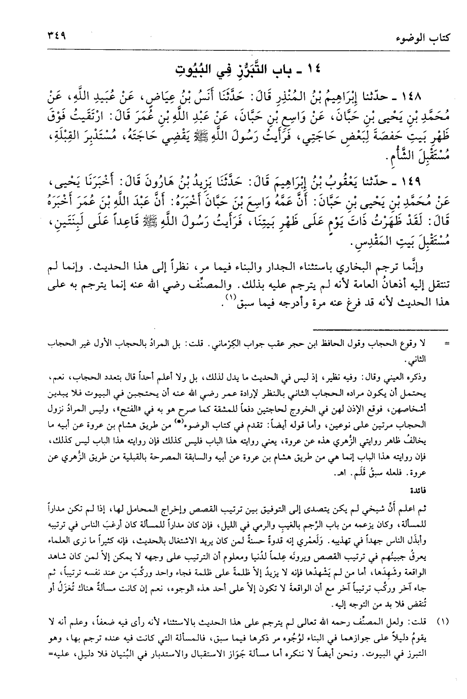 148 - حَدَّثَنَا إِبْرَاهِيمُ بْنُ الْمُنْذِرِ قَالَ حَدَّثَنَا أَنَسُ بْنُ عِيَاضٍ عَنْ عُبَيْدِ اللَّهِ عَنْ مُحَمَّدِ بْنِ يَحْيَى بْنِ حَبَّانَ عَنْ وَاسِعِ بْنِ حَبَّانَ عَنْ عَبْدِ اللَّهِ بْنِ عُمَرَ قَالَ ارْتَقَيْتُ فَوْقَ ظَهْرِ بَيْتِ حَفْصَةَ لِبَعْضِ حَاجَتِى، فَرَأَيْتُ رَسُولَ اللَّهِ - صلى الله عليه وسلم - يَقْضِى حَاجَتَهُ مُسْتَدْبِرَ الْقِبْلَةِ مُسْتَقْبِلَ الشَّأْمِ. أطرافه 145، 149، 3102 - تحفة 8552