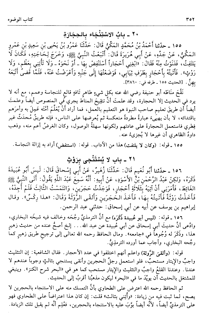 ثم الحافظ رحمه الله اعترض على الطحاوي بأنَّ التمسك منه على الاستنجاء بالحجرين لا يصح، لما ثبت فيه من زيادة: «وأْتِني بثالث» قلت: إن كان هذا اعتراضًا على الطحاوي فهو على الترمذيِّ أيضًا، لأنَّه أيضًا بوَّبَ عليه بالاستنجاء بالحجرين، فعُلِم أنَّه لم يقبل تلك الزيادة.