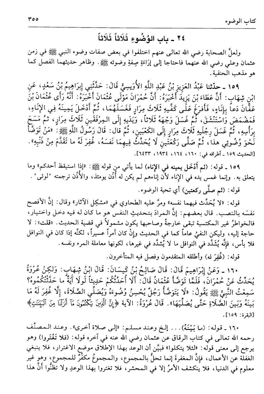159 - حَدَّثَنَا عَبْدُ الْعَزِيزِ بْنُ عَبْدِ اللَّهِ الأُوَيْسِىُّ قَالَ حَدَّثَنِى إِبْرَاهِيمُ بْنُ سَعْدٍ عَنِ ابْنِ شِهَابٍ أَنَّ عَطَاءَ بْنَ يَزِيدَ أَخْبَرَهُ أَنَّ حُمْرَانَ مَوْلَى عُثْمَانَ أَخْبَرَهُ أَنَّهُ رَأَى عُثْمَانَ بْنَ عَفَّانَ دَعَا بِإِنَاءٍ، فَأَفْرَغَ عَلَى كَفَّيْهِ ثَلاَثَ مِرَارٍ فَغَسَلَهُمَا، ثُمَّ أَدْخَلَ يَمِينَهُ فِى الإِنَاءِ فَمَضْمَضَ، وَاسْتَنْشَقَ، ثُمَّ غَسَلَ وَجْهَهُ ثَلاَثًا، وَيَدَيْهِ إِلَى الْمِرْفَقَيْنِ ثَلاَثَ مِرَارٍ، ثُمَّ مَسَحَ بِرَأْسِهِ، ثُمَّ غَسَلَ رِجْلَيْهِ ثَلاَثَ مِرَارٍ إِلَى الْكَعْبَيْنِ، ثُمَّ قَالَ قَالَ رَسُولُ اللَّهِ - صلى الله عليه وسلم - «مَنْ تَوَضَّأَ نَحْوَ وُضُوئِى هَذَا، ثُمَّ صَلَّى رَكْعَتَيْنِ، لاَ يُحَدِّثُ فِيهِمَا نَفْسَهُ، غُفِرَ لَهُ مَا تَقَدَّمَ مِنْ ذَنْبِهِ». أطرافه 160، 164، 1934، 6433 - تحفة 9794