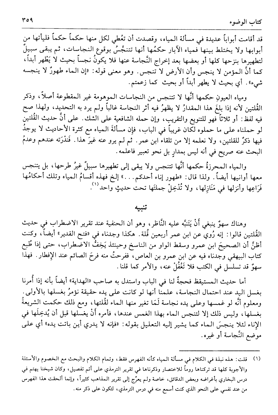 قد أقامت أبوابًا عديدة في مسألة المياه، وقصدت أن تعُطي لكل منها حكمًا حكمًا فليأتها من أبوابها ولا يختلط بينها فمياه الآبار حكمُها أنها تتنجَّسُ بوقوع النجاسات، ثم يبقى سبيلٌ بنزحها كلها أو بعضها بعد إخراج النَّجاسة عنها فلا يكونُ نجسًا بحيث لا يَطْهر أبدًا، كما أنَّ المؤمن لا ينجس وأن الأرض لا تنجس. وهو معنى قوله: «إن الماء طهورٌ لا ينجسه شيء». أي بحيث لا يطهر أبدًا أو بحيث كما زعمتم.