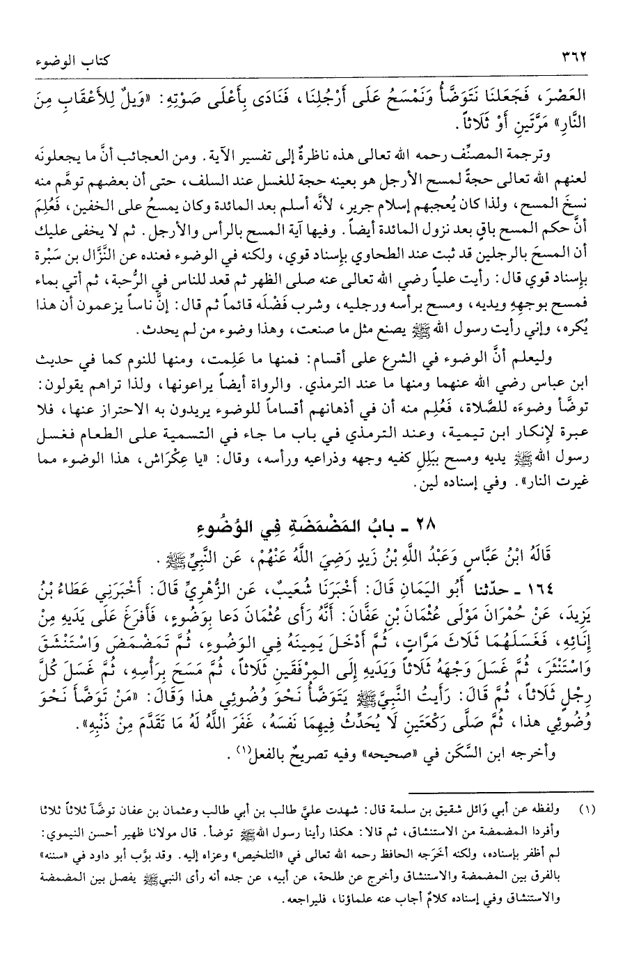 (¬1) ولفظه عن أبي وَائل شقيق بن سلمة قال: شهدت عليَّ طالب بن أبي طالب وعثمان بن عفان توضّآ ثلاثًا ثلاثا وأفردا المضمضة من الاستنشاق، ثم قالا: هكذا رأينا رسول الله - صلى الله عليه وسلم - توضأ. قال مولانا ظهير أحسن النيموي: لم أظفر بإسناده، ولكنه أخَرَجه الحافظ رحمه الله تعالى في "التلخيص" وعزاه إليه. وقد بوَّب أبو داود في "سننه" بالفرق بين المضمضة والاستنشاق وأخرج عن طلحة، عن أبيه، عن جده أنه رأى النبي - صلى الله عليه وسلم - يفصل بين المضمضة والاستنشاق وفي إسناده كلامٌ أجاب عنه علماؤنا، فليراجعه.