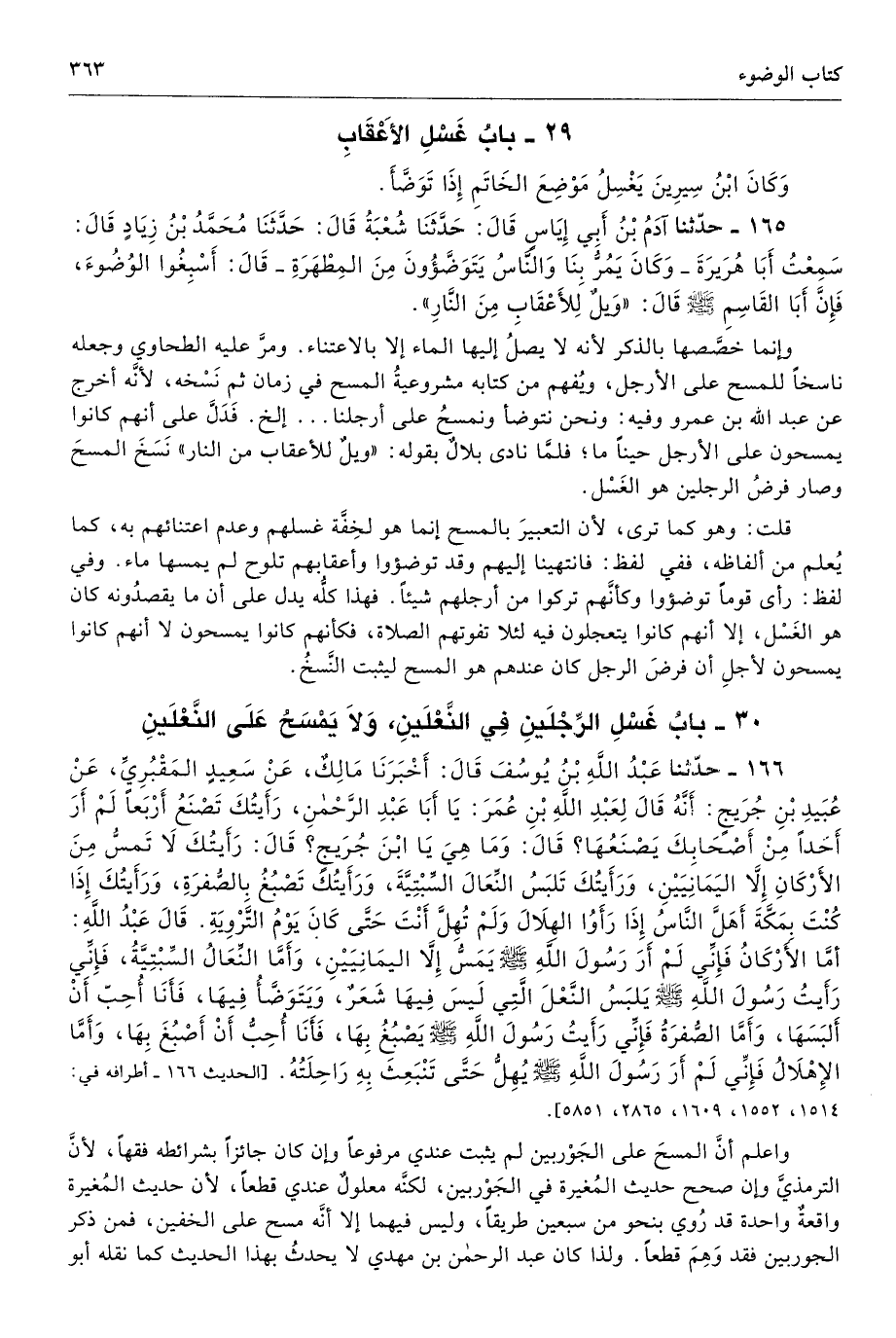 وإنما خصَّصها بالذكر لأنه لا يصلُ إليها الماء إلا بالاعتناء. ومرَّ عليه الطحاوي وجعله ناسخًا للمسح على الأرجل، ويُفهم من كتابه مشروعيةُ المسح في زمان ثم نَسْخه، لأنَّه أخرج عن عبد الله ابن عمرو وفيه: ونحن نتوضأ ونمسحُ على أرجلنا ... إلخ. فَدَلَّ على أنهم كانوا يمسحون على الأجل حينًا ما؛ فلمَّا نادى بلالٌ بقوله: «ويلٌ للأعقاب من النار» نَسَخَ المسحَ وصار فرضُ الرجلين هو الغَسْل.