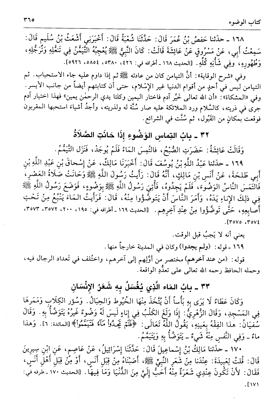 168 - حَدَّثَنَا حَفْصُ بْنُ عُمَرَ قَالَ حَدَّثَنَا شُعْبَةُ قَالَ أَخْبَرَنِى أَشْعَثُ بْنُ سُلَيْمٍ قَالَ سَمِعْتُ أَبِى عَنْ مَسْرُوقٍ عَنْ عَائِشَةَ قَالَتْ كَانَ النَّبِىُّ - صلى الله عليه وسلم - يُعْجِبُهُ التَّيَمُّنُ فِى تَنَعُّلِهِ وَتَرَجُّلِهِ وَطُهُورِهِ وَفِى شَأْنِهِ كُلِّهِ. أطرافه 426، 5380، 5854، 5926 - تحفة 17657