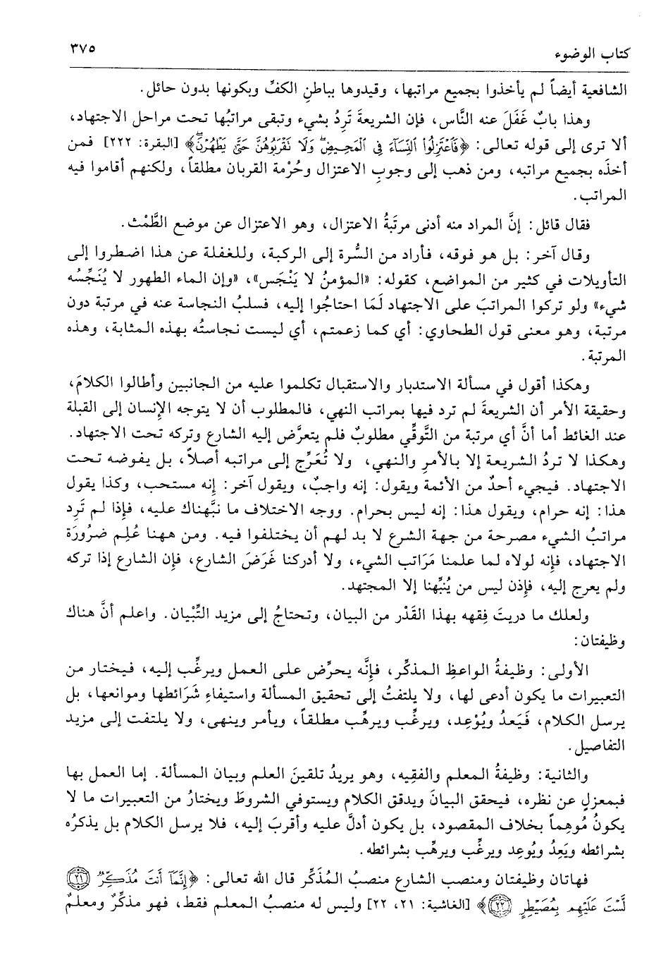 وهذا بابٌ غَفَلَ عنه النَّاس، فإن الشريعةَ تَرِدُ بشيء وتبقى مراتبُها تحت مراحل الاجتهاد، ألا ترى إلى قوله تعالى: {فَاعْتَزِلُواْ النّسَآء فِي الْمَحِيضِ وَلاَ تَقْرَبُوهُنَّ حَتَّى يَطْهُرْنَ} [البقرة: 222] فمن أخذَه بجميع مراتبه، ومن ذهب إلى وجوبِ الاعتزال وحُرْمة القربان مطلقًا، ولكنهم أقاموا فيه المراتب.