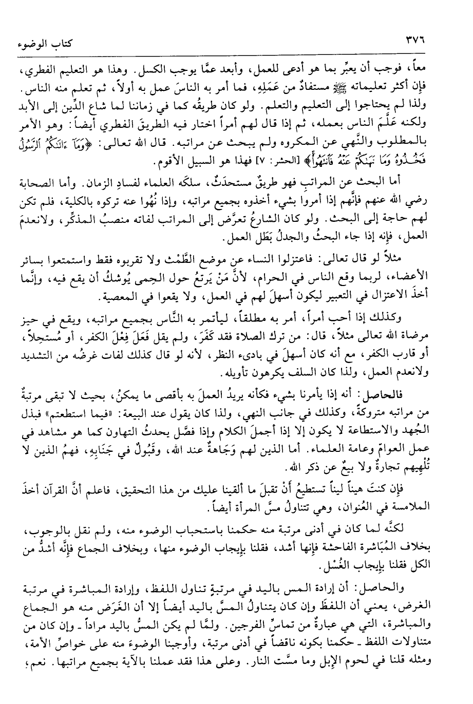 أما البحث عن المراتبِ فهو طريقٌ مستحدَثٌ، سلكَه العلماء لفسادِ الزمان. وأما الصحابة رضي الله عنهم فإنَّهم إذا أمروا بشيء أخذوه بجميع مراتبه، وإذا نُهُوا عنه تركوه بالكلية، فلم تكن لهم حاجة إلى البحث. ولو كان الشارعُ تعرَّض إلى المراتب لفاته منصبُ المذكِّر، ولانعدمَ العمل، فإِنه إذا جاء البحثُ والجدلُ بَطَل العمل.