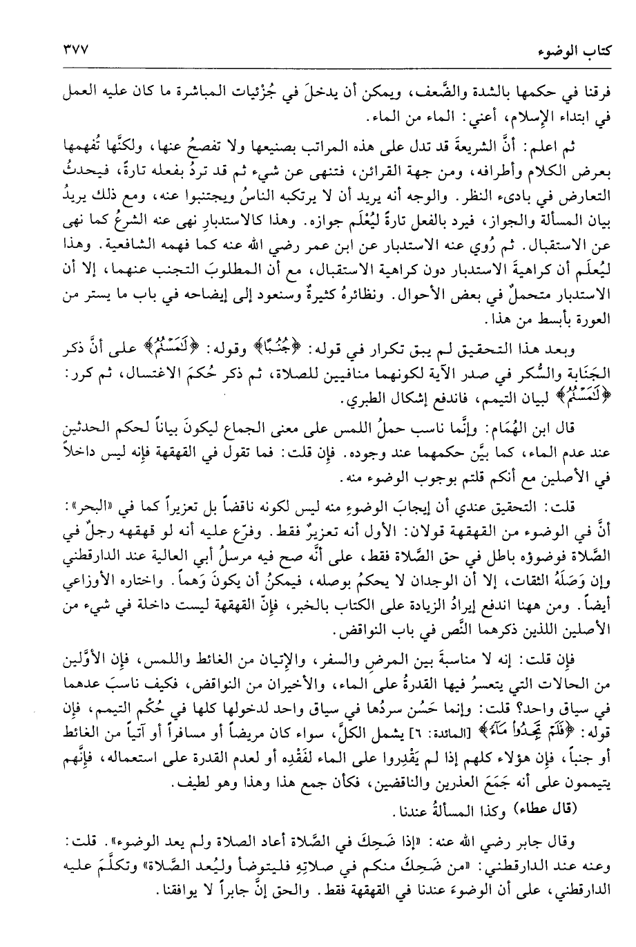قال ابن الهُمَام: وإنَّما ناسب حملُ اللمس على معنى الجماع ليكونَ بيانًا لحكم الحدثين عند عدم الماء، كما بيَّن حكمهما عند وجوده. فإِن قلت: فما تقول في القهقهة فإِنه ليس داخلًا في الأصلين مع أنكم قلتم بوجوب الوضوء منه.