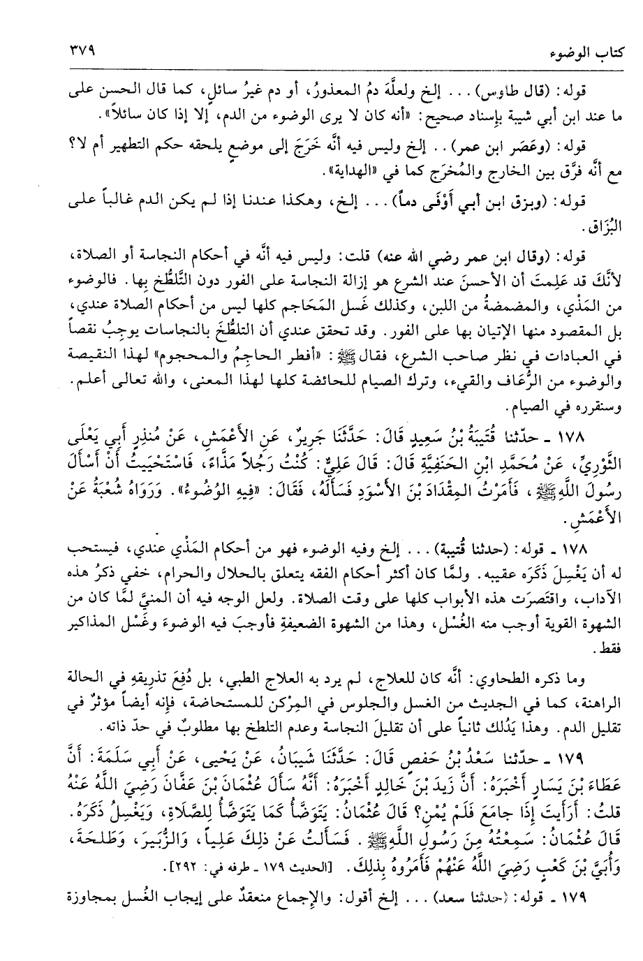 178 - قوله: (حدثنا قُتيبة) ... إلخ وفيه الوضوء فهو من أحكام المَذْي عندي، فيستحب له أن يَغْسِلَ ذَكَرَه عقيبه. ولمَّا كان أكثر أحكام الفقه يتعلق بالحلال والحرام، خفي ذكرُ هذه الآداب، واقتَصرَت هذه الأبواب كلها على وقت الصلاة. ولعل الوجه فيه أن المنيَّ لمَّا كان من الشهوة القوية أوجب منه الغُسْل، وهذا من الشهوة الضعيفةِ فأوجبَ فيه الوضوءَ وغَسْل المذاكير فقط.