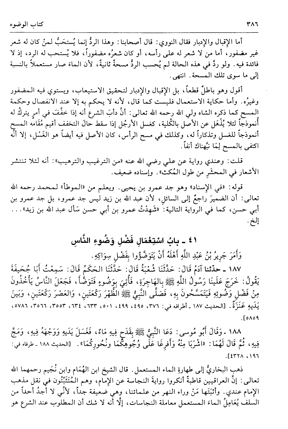 أقول وهو باطلٌ قطعًا، بل الإِقبال والإِدبار لتحقيق الاستيعاب، ويستوي فيه المضفور وغيرُه. وأما حكاية الاستعمال فليست كما قال، لأنه لا يحكم به إلا عند الانفصال وحكمه المسح كما ذكره الشاه ولي الله رحمه الله تعالى: أنَّ دأبَ الشرع أنه إذا خفَّفَ في أمرٍ يتركُ له أُنموذجًا لئلا يُذْهَل عن الأصل بالكُلية، كغسل الأرجُل إذا سقط حالَ المَخفف أقيم مُقَامه المسح أنموذجًا للغسل وتذكارًا له، وكذلك في مسح الرأس، كان الأصل فيه أيضًا هو الغَسْل، إلا أنَّه اكتفى بالمسح لِمَا نبَّهناك أنفًا.