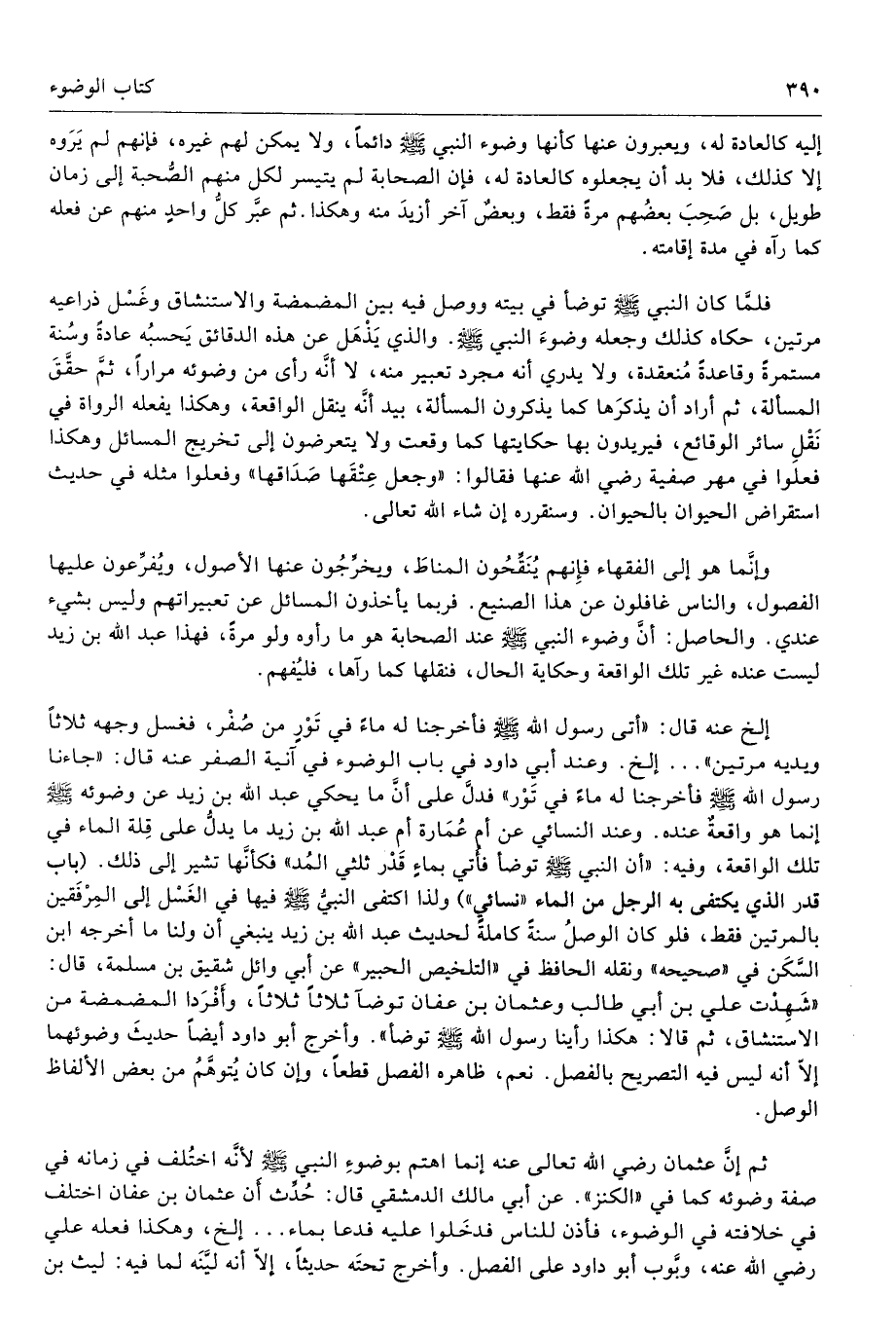وإنَّما هو إلى الفقهاء فإِنهم يُنَقِّحُون المناطَ، ويخرِّجُون عنها الأصول، ويُفرِّعون عليها الفصول، والناس غافلون عن هذا الصنيع. فربما يأخذون المسائل عن تعبيراتهم وليس بشيء عندي. والحاصل: أنَّ وضوء النبي صلى الله عليه وسلّم عند الصحابة هو ما رأوه ولو مرةً، فهذا عبد الله بن زيد ليست عنده غير تلك الواقعة وحكاية الحال، فنقلها كما رآها، فليُفهم.