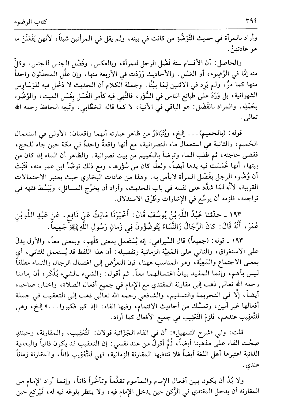193 - قوله: (جميعًا) قال السِّيرافي: إنه يُسْتَعمل بمعنى كلّهم، وبمعنى معًا، والأول يدلّ على الاستغراق، والثاني على المَعِيَّة الزمانية وتفصيله: أن هذا اللفظ قد يُسَتْعْمَل للاستغراق وإحاطة الأفراد مع قطع النظر عن الاجتماع، وقد يُسْتَعْمَل للثاني، أي بمعنى الاجتماع والمَعِيَّة، وهو المناسب ههنا، فإن التعرُّض إلى اغتسال الرجال والنساء مطلقًا ليس بأهم، وإنما المفيد بيانُ اغتسالهما معًا. ثم أقول: والشيء بالشيء يُذْكَر، أن إمامنا رحمه الله تعالى ذهب إلى مقارنة المقتدي مع الإِمام في حميع أفعال الصلاة، واختاره صاحباه أيضًا، إلا في التحريمة والتسليم، والشافعي رحمه الله تعالى ذهب إلى التعقيب في جملة أفعالها غير آمين، وتمسَّك من أحاديث الائتمام، وفيها الفاء: «إذا كبر فكبروا ... » إلخ، وهي للتَّعقِيب عندهم، فَلزمَ التَّعْقِيب في جميع الأفعال كما أراد.