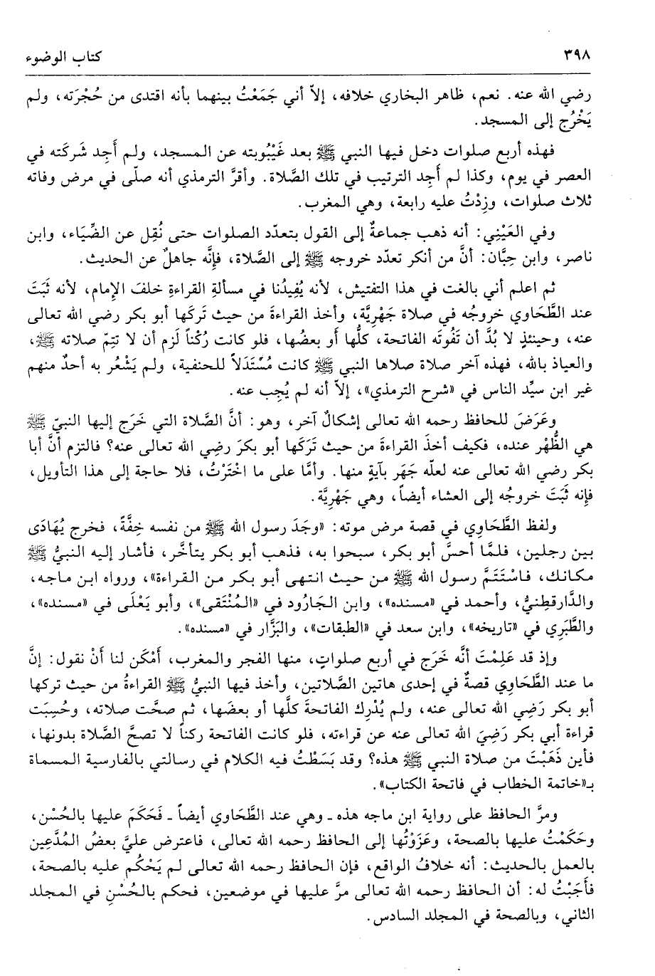 وإذ قد عَلِمْتَ أنَّه خَرَج في أربع صلواتٍ، منها الفجر والمغرب، أَمْكَن لنا أَنْ نقول: إنَّ ما عند الطَّحَاوِي قصةٌ في إحدى هاتين الصَّلاتين، وأخذ فيها النبيُّ صلى الله عليه وسلّم القراءةُ من حيث تركها أبو بكر رَضِي الله تعالى عنه، ولم يُدْرِك الفاتحةَ كلَّها أو بعضَها، ثم صحَّت صلاته، وحُسِبَت قراءة أبي بكر رَضِيَ الله تعالى عنه عن قراءته، فلو كانت الفاتحة ركنًا لا تصحَّ الصَّلاة بدونها، فأين ذَهَبْتَ من صلاة النبي صلى الله عليه وسلّم هذه؟ وقد بَسَطْتُ فيه الكلام في رسالتي بالفارسية المسماة ب «خاتمة الخطاب في فاتحة الكتاب».