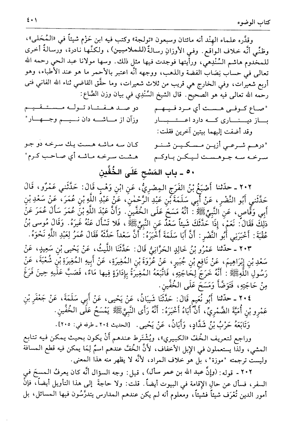 202 - قوله: (وإِنَّ عبد الله بن عمر سأل)، قيل: وجه السؤال أنَّه كان يعرفُ المسحَ في السفر، فسأل عن حالِ الإِقامة في البيوت أيضًا. قلت: ولا حاجةَ إلى هذا التأويل أيضًا، فإنَّ أمورِالدين تُعْرَف شيئًا فشيئًا، ومعلوم أنه لم يكن عندهم المدارس يتدرَّسُون فيها المسائل، بل