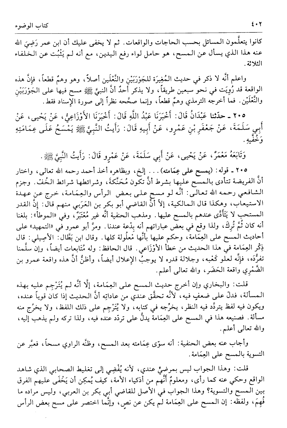 205 - قوله: (يمسح على عِمَامته) ... إلخ، وبظاهره أخذ أحمد رحمه الله تعالى، واختار أنَّ الفريضة تتأدى بالمسح عليها بشرط أنَّ تكون مُحَنَّكةَ، وشرائطها شرائط الخُفّ. وجزم الشافعي رحمه الله تعالى: أنَّه لو مسح على بعض الرأس والعِمَامة، خرج عن عهدة الاستيعاب، وهكذا قال الماليكة، إلاّ أنَّ القاضي أبو بكر بن العَرَبي منهم قال: إِنَّ القدر المستحب لا يَتَأَدَّى عندهم بالمسح عليها. ومذهب الحنفية أنَّه غير مُعْتَبَرٌ، وفي «الموطأ»: بلغنا أنه كان ثُمَّ تُرِكَ، ولذا وقع في بعض عباراتهم أنه بِدْعة عندنا. ومرَّ أبو عمرو في «التمهيد» على أحاديث المسح على العِمَامة، وحكم عليها بأنَّها مْعلُولة كلها. وقال ابن بَطَّال: الأصِيلي: ذِكْر العِمَامة في هذا الحديث من خطأ الأوْزَاعي. قال الحافظ: وله مُتَابعات أيضًا، وإن سلَّمنا تفرُّدَه، فإِنَّه لعلو كَعْبه، وجلالة قدره لا يوجبُ الإِعلال أيضًا، وأظنُّ أنَّ هذه واقعة عمرو بن الضَّمْرِي واقعة الخَضَر، والله تعالى أعلم.