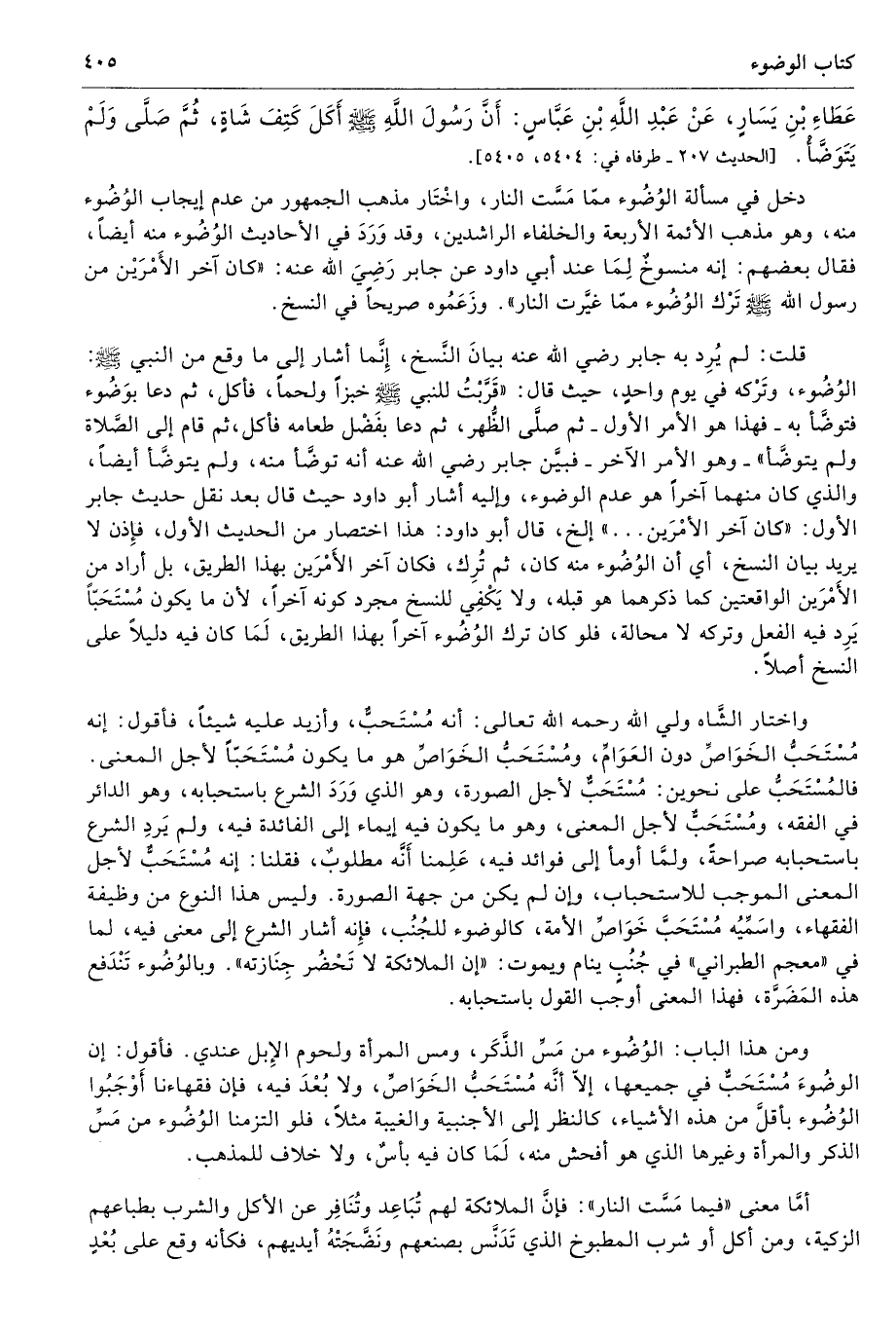 دخل في مسألة الوُضُوء ممّا مَسَّت النار، واخْتَار مذهب الجمهور من عدم إيجاب الوُضُوء منه، وهو مذهب الأئمة الأربعة والخلفاء الراشدين، وقد وَرَدَ في الأحاديث الوُضُوء منه أيضًا، فقال بعضهم: إنه منسوخٌ لِمَا عند أبي داود عن جابر رَضِيَ الله عنه: «كان آخر الأَمْرَيْن من رسول الله صلى الله عليه وسلّم تَرْك الوُضُوء ممّا غيَّرت النار». وزَعَمُوه صريحًا في النسخ.