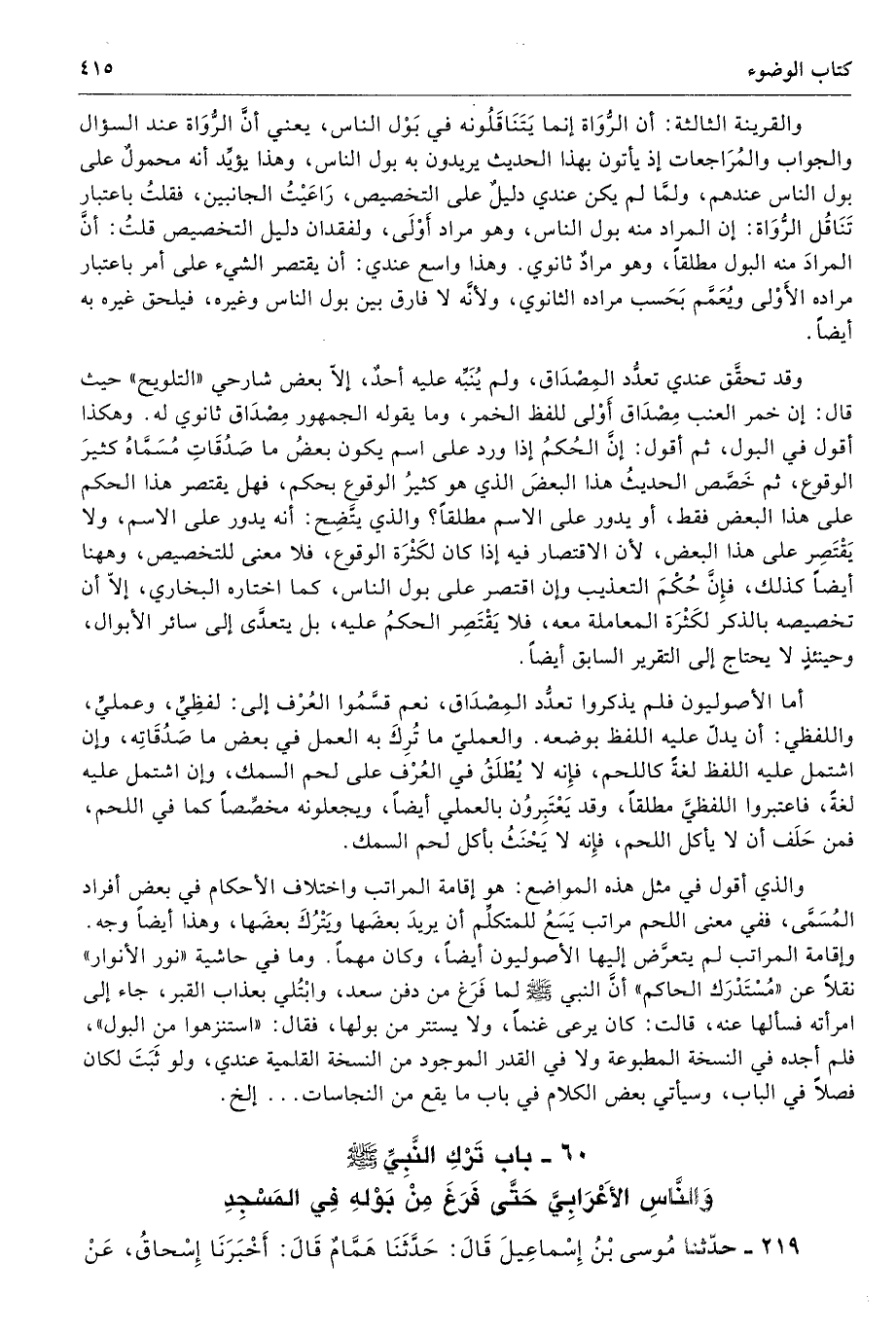 والذي أقول في مثل هذه المواضع: هو إقامة المراتب واختلاف الأحكام في بعض أفراد المُسَمَّى، ففي معنى اللحم مراتب يَسَعُ للمتكلِّم أن يريدَ بعضَها ويَتْرُكَ بعضَها، وهذا أيضًا وجه. وإقامة المراتب لم يتعرَّض إليها الأصوليون أيضًا، وكان مهمًا. وما في حاشية «نور الأنوار» نقلًا عن «مُسْتَدْرَك الحاكم» أنَّ النبي صلى الله عليه وسلّم لما فَرَغ من دفن سعد، وابْتُلي بعذاب القبر، جاء إلى امرأته فسألها عنه، قالت: كان يرعى غنمًا، ولا يستتر من بولها، فقال: «استنزهوا من البول»، فلم أجده في النسخة المطبوعة ولا في القدر الموجود من النسخة القلمية عندي، ولو ثَبَتَ لكان فصلًا في الباب، وسيأتي بعض الكلام في باب ما يقع من النجاسات ... إلخ.