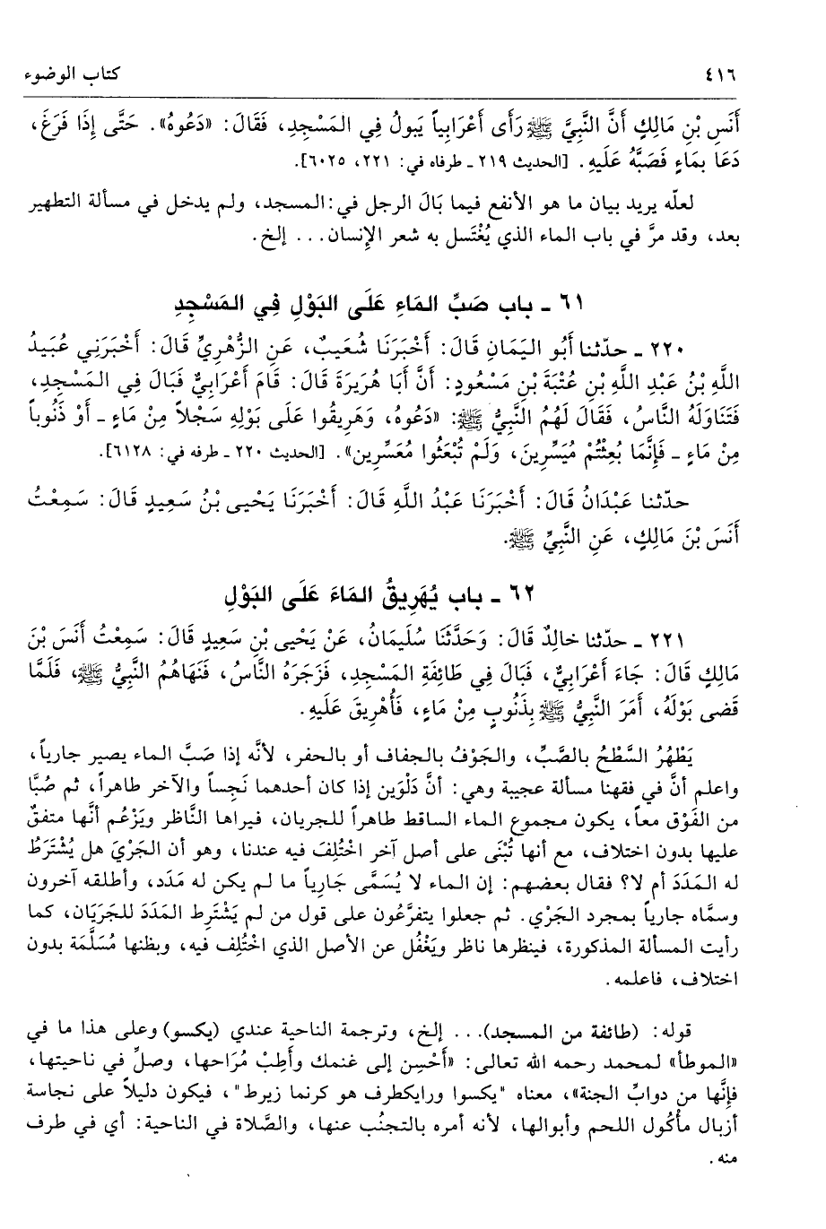 أَنَسِ بْنِ مَالِكٍ أَنَّ النَّبِىَّ - صلى الله عليه وسلم - رَأَى أَعْرَابِيًّا يَبُولُ فِى الْمَسْجِدِ فَقَالَ «دَعُوهُ». حَتَّى إِذَا فَرَغَ دَعَا بِمَاءٍ فَصَبَّهُ عَلَيْهِ. أطرافه 221، 221 م، 6025 - تحفة 216