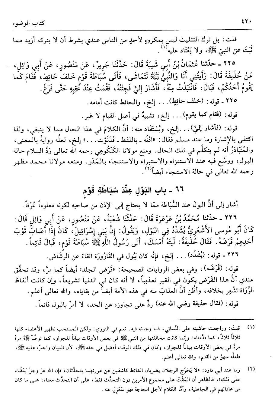 225 - حَدَّثَنَا عُثْمَانُ بْنُ أَبِى شَيْبَةَ قَالَ حَدَّثَنَا جَرِيرٌ عَنْ مَنْصُورٍ عَنْ أَبِى وَائِلٍ عَنْ حُذَيْفَةَ قَالَ رَأَيْتُنِى أَنَا وَالنَّبِىُّ - صلى الله عليه وسلم - نَتَمَاشَى، فَأَتَى سُبَاطَةَ قَوْمٍ خَلْفَ حَائِطٍ، فَقَامَ كَمَا يَقُومُ أَحَدُكُمْ فَبَالَ، فَانْتَبَذْتُ مِنْهُ، فَأَشَارَ إِلَىَّ فَجِئْتُهُ، فَقُمْتُ عِنْدَ عَقِبِهِ حَتَّى فَرَغَ. أطرافه 224، 226، 2471 - تحفة 3335