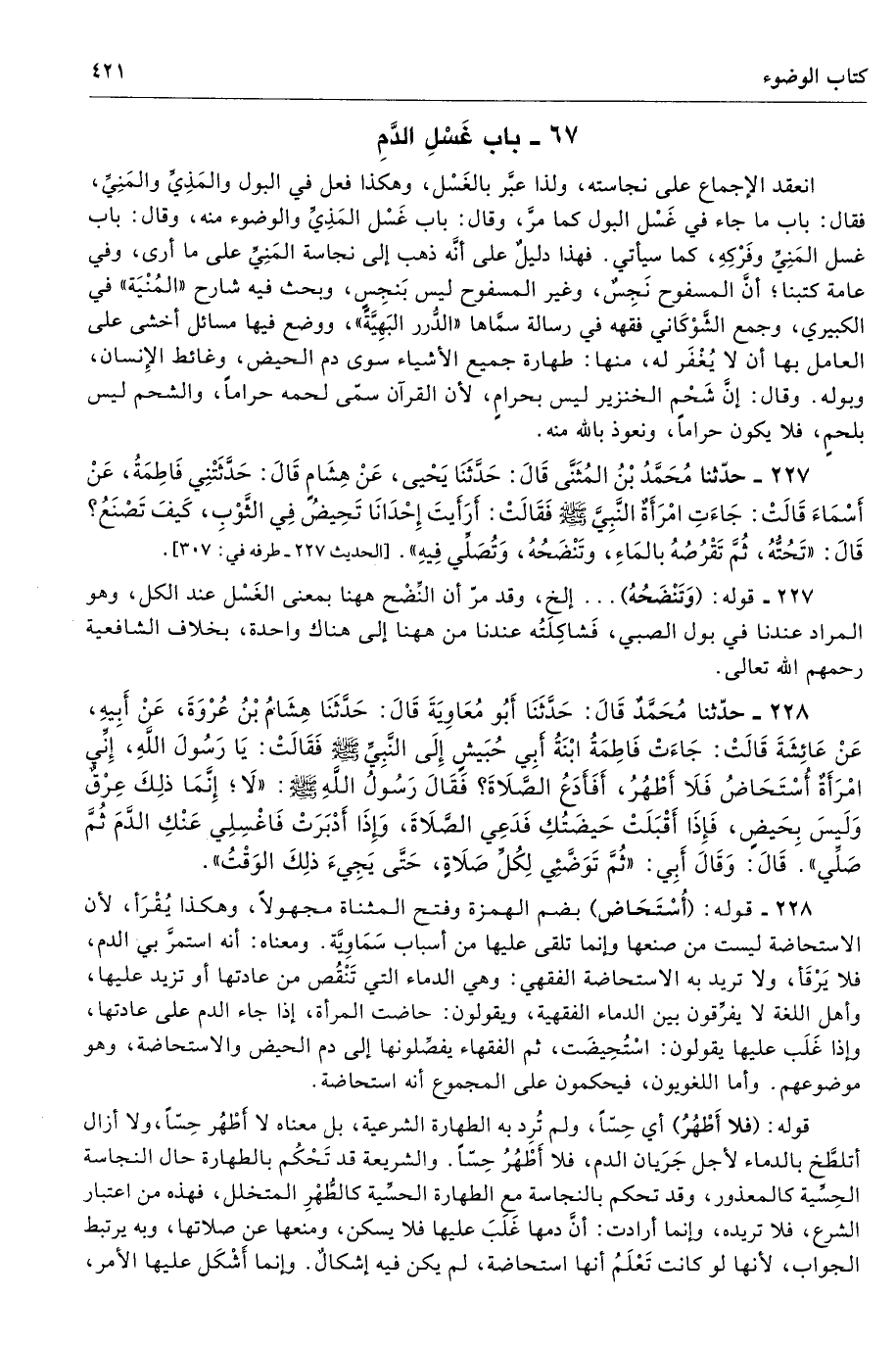 228 - قوله: (أُسْتَحَاض) بضم الهمزة وفتح المثناة مجهولًا، وهكذا يُقْرَأ، لأن الاستحاضة ليست من صنعها وإنما تلقى عليها من أسباب سَمَاوِيَّة. ومعناه: أنه استمرَّ بي الدم، فلا يَرْقَأ، ولا تريد به الاستحاضة الفقهي: وهي الدماء التي تَنْقُص من عادتها أو تزيد عليها، وأهل اللغة لا يفرِّقون بين الدماء الفقهية، ويقولون: حاضت المرأة، إذا جاء الدم على عادتها، وإذا غَلَب عليها يقولون: أُسْتُحِيضَت، ثم الفقهاء يفصِّلونها إلى دم الحيض والاستحاضة، وهو موضوعهم. وأما اللغويون، فيحكمون على المجموع أنه استحاضة.