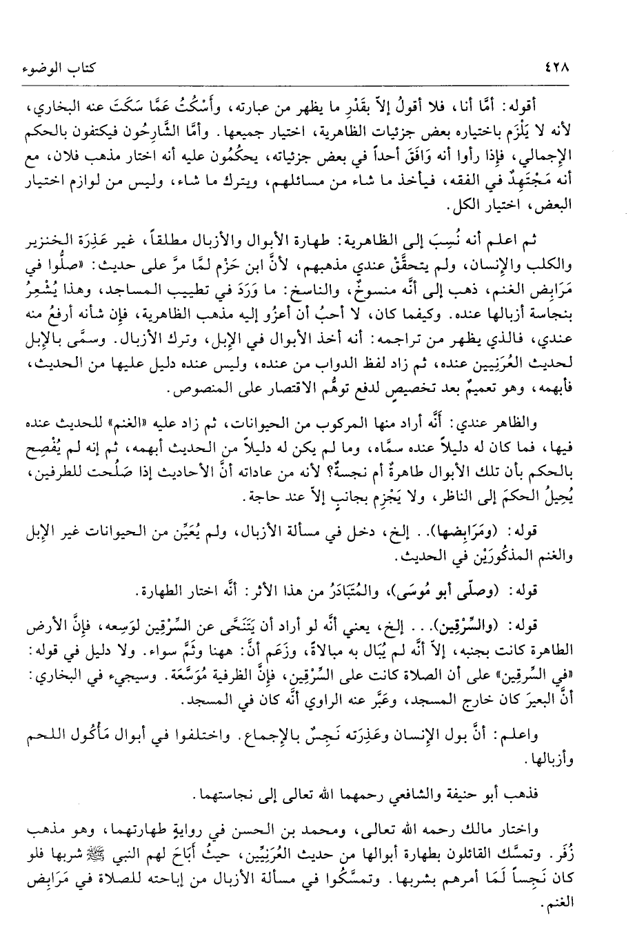 ثم اعلم أنه نُسِبَ إلى الظاهرية: طهارة الأبوال والأزبال مطلقًا، غير عَذِرَة الخنزير والكلب والإِنسان، ولم يتحقَّقَ عندي مذهبه، لأنَّ ابن حَزْم لمَّا مرَّ على حديث: «صلُّوا في مَرَابِض الغنم، ذهب إلى أنَّه منسوخٌ، والناسخ: ما وَرَدَ في تطييب المساجد، وهذا يُشْعِرُ بنجاسة أزبالها عنده. كيفما كان، لا أحبُ أن أعزُو إليه مذهب الظاهرية، فإِن شأنه أرفعُ منه عندي، فالذي يظهر من تراجمه: أنه أخذ الأبوال في الإِبل، وترك الأزبال. وسمَّى بالإِبل لحديث العُرَنِييِّن عنده، ثم زاد لفظ الدواب من عنده، وليس عنده دليل عليها من الحديث، فأبهمه، وهو تعميمٌ بعد تخصيصٍ لدفع توهُّم الاقتصار على المنصوص.