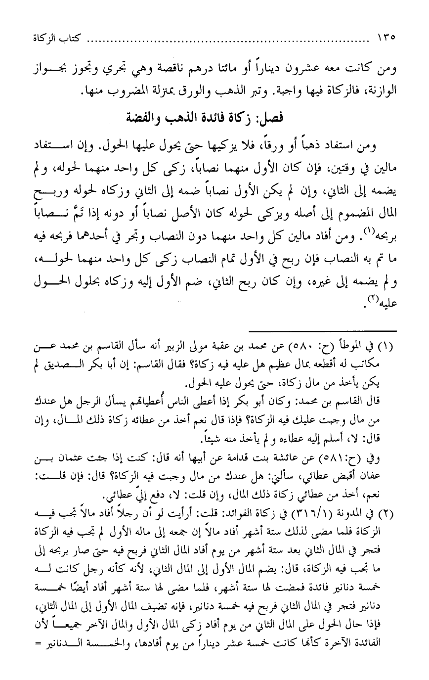 ومن استفاد ذهبصا أو ورقًا، فال يزكيهاحتى يحول عليها الحول. وإن استفاد مالين في وقتين، فإ، كان الأول منهما نصابًا، زكى كل واحد منهما لحوله، ولم يضمه إلى الثاني، وإن لم يكن الأول نصابًا ضمه إلى الثاني وزكاه لحوله وربح المال المضموم إلى أصله ويزكى لحوله كان الأصل نصاباً أو دونه إذا تَمَّ نصابًا بربحه. ومن أفاد مالين كل واحد منهما دون النصاب وتجر في أحدهما فربحه فيه ما تم به النصاب فإنه ربح في الأول تمام النصاب زكى كل واحد منهما لحوله، ولم يضمه إلى غيره، وإن كان ربح الثاني، ضم الأول إليه وزكاه بحلول الحول عليه.